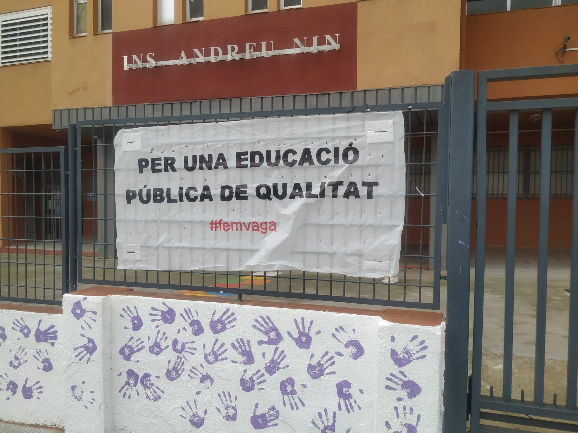 A conseqüència del descontentament causat pels diversos anuncis del Departament d’Educació de cara al curs vinent, el professorat de l’Andreu Nin hem decidit mobilitzar-nos de cara a protestar i mostrar el nostre enuig i punt de vista contraris a uns canvis imposats de manera improvisada i sense consensuar. Per aquest motiu l’Assemblea Docent de l’Andreu Nin hem decidit elaborar dues pancartes que pengen als accessos dels dos edificis principals del centre, ens adherim a la vaga i hem elaborat cartells que portarem tant dimarts a la manifestació unitària a Barcelona com a la que està convocada per avui dilluns a les sis de la tarda a la plaça Vella del Vendrell.
