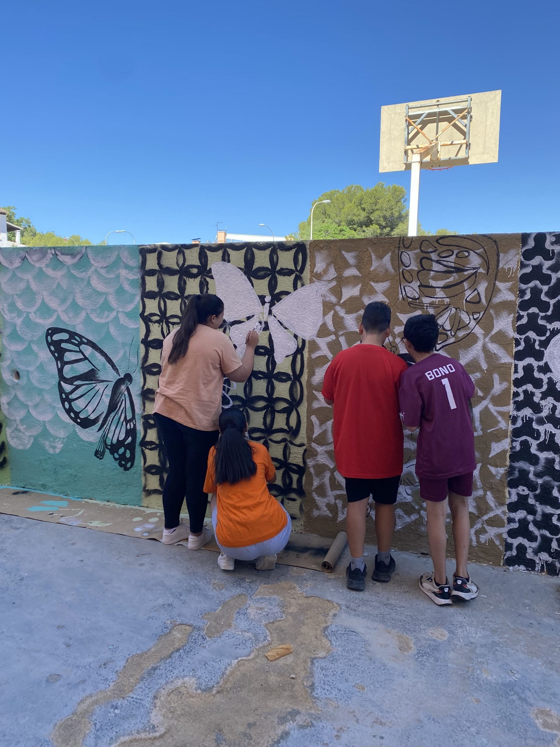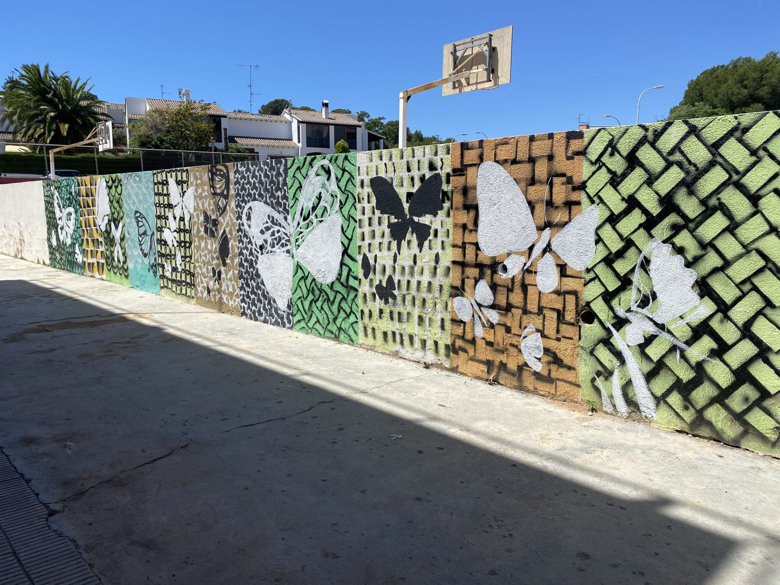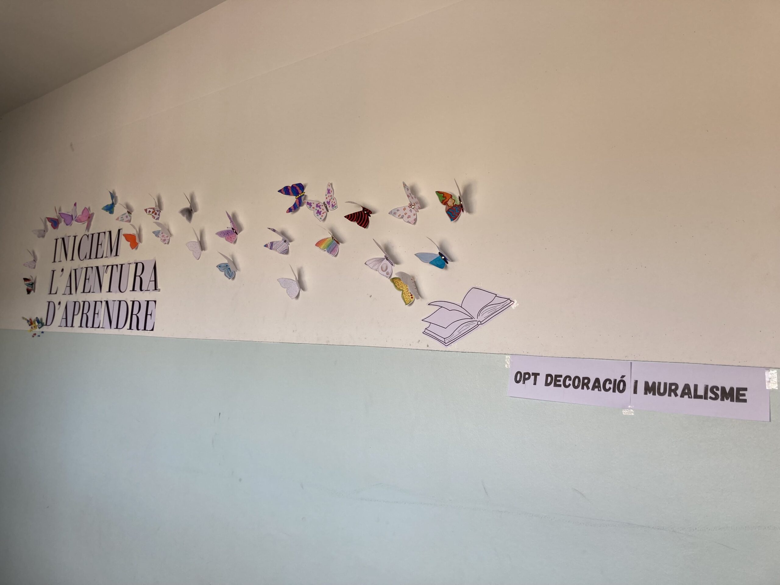 Els alumnes han pintat el mur, han jugat amb plantilles per fer textures amb graffiti a la paret i finalment, l’hem decorat amb papallones. Al començament de curs, el primer mural a la paret ja va consistir en decorar unes papallones decorades simbolitzant el coneixement.
