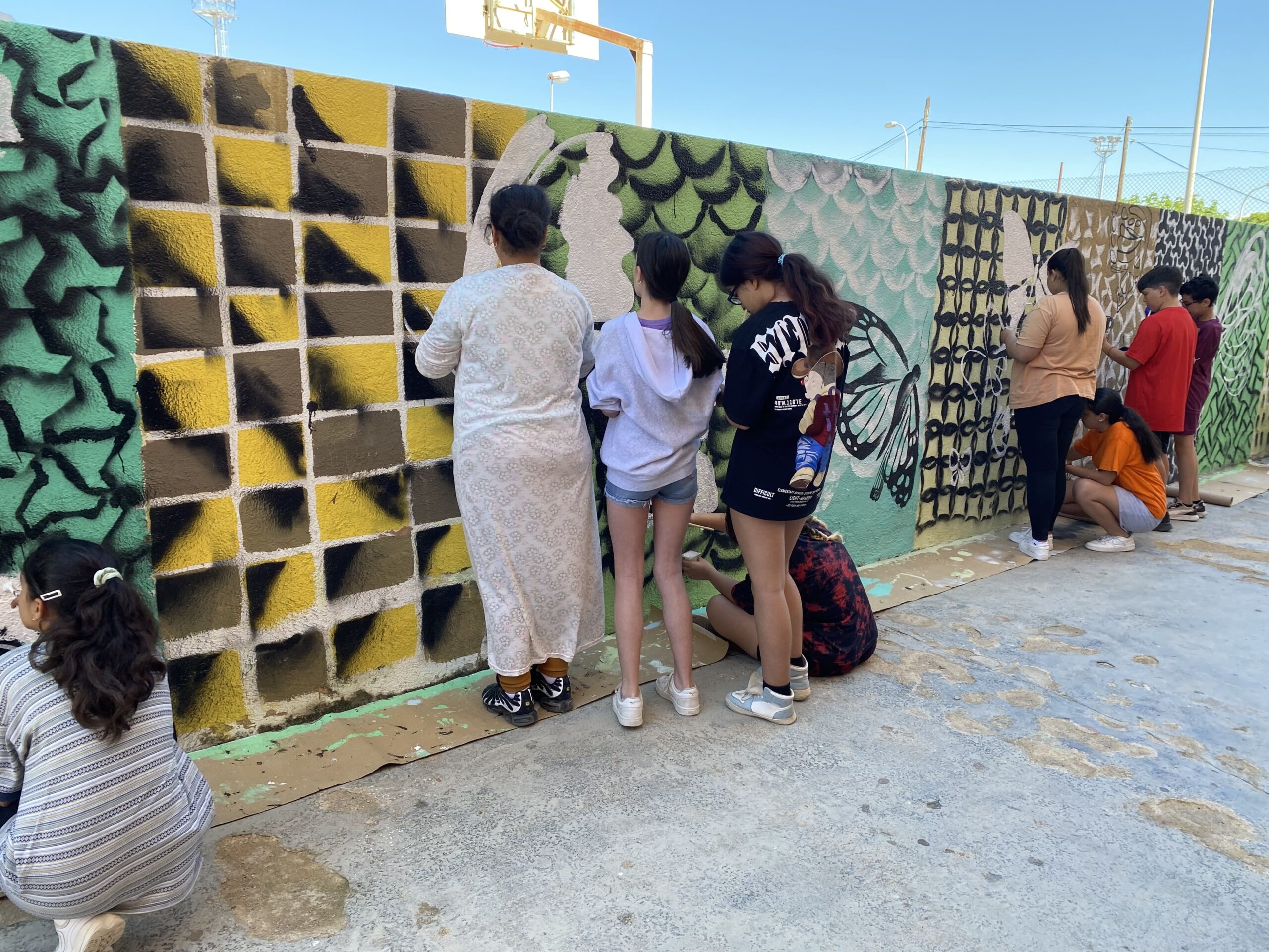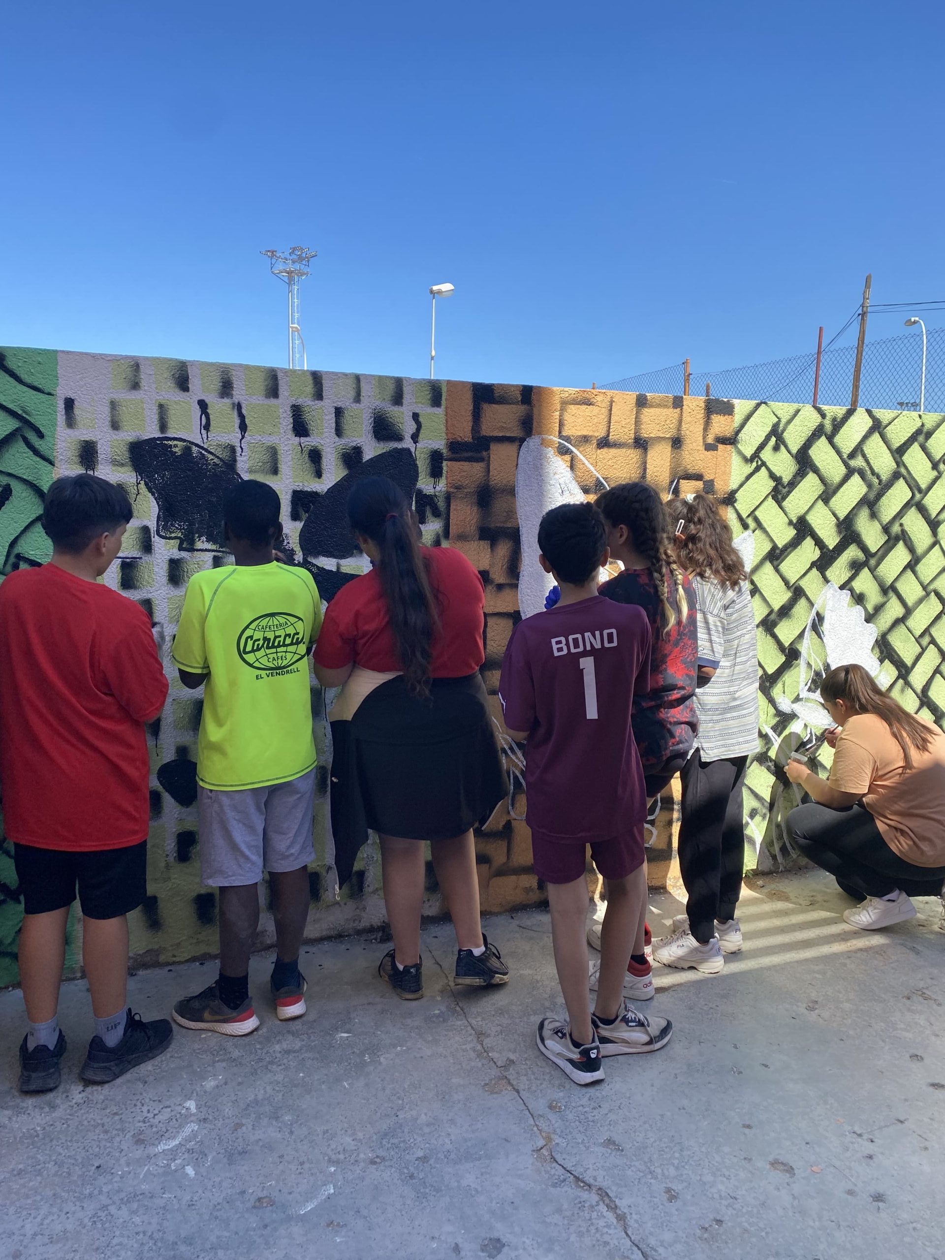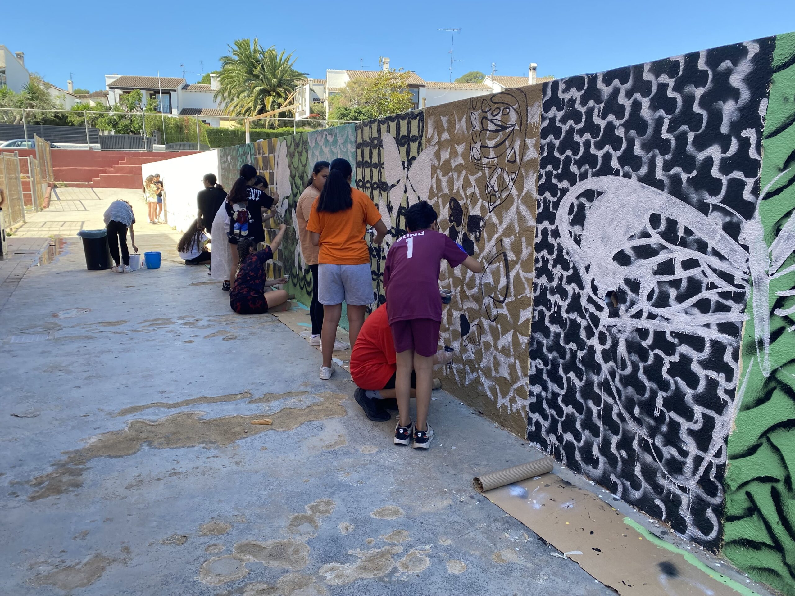 Els alumnes han pintat el mur, han jugat amb plantilles per fer textures amb graffiti a la paret i finalment, l’hem decorat amb papallones. Al començament de curs, el primer mural a la paret ja va consistir en decorar unes papallones decorades simbolitzant el coneixement.