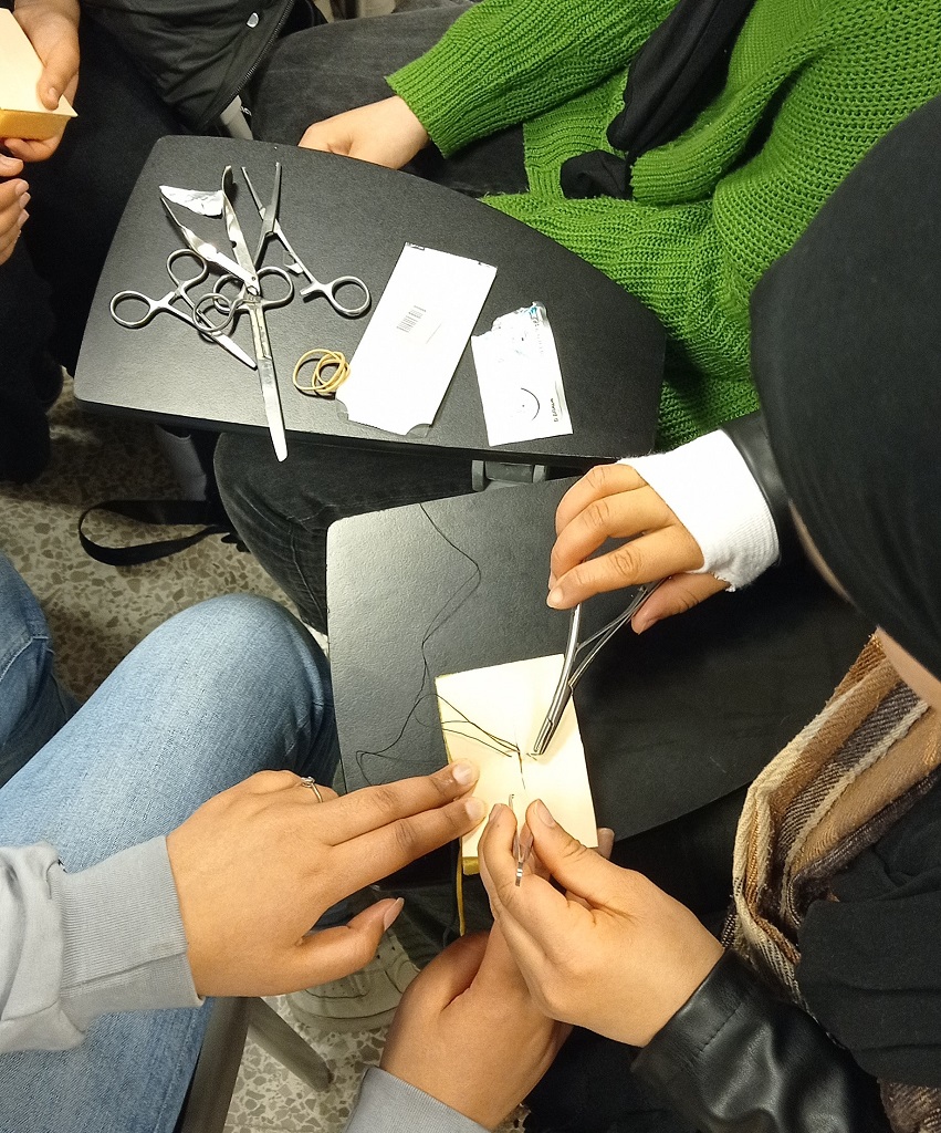 El passat 22 d’abril l’alumnat del CFGM de Cures Auxiliars d’Infermeria va gaudir d’un taller de sutures, on van descobrir els diferents tipus bàsics de material per a tal efecte i van poder practicar tècniques bàsiques per a suturar de la mà de la nostra docent Mireia Rodríguez.