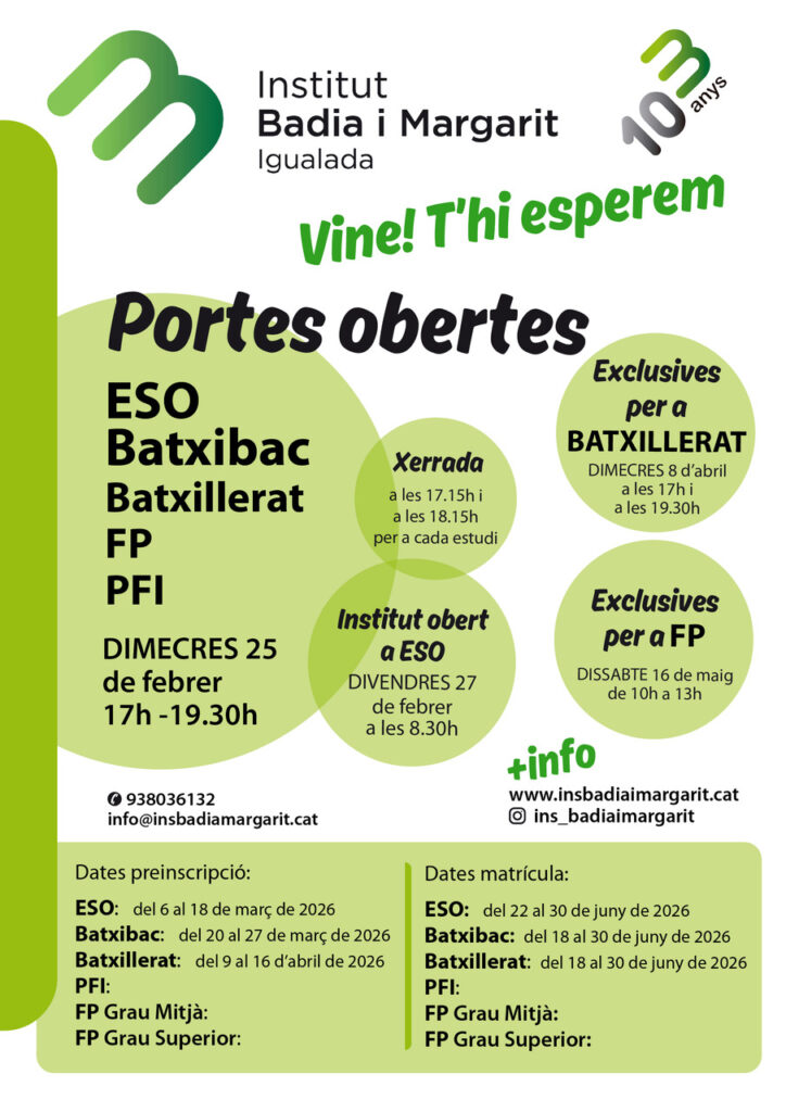 - PORTES OBERTES BATXILLERAT: Dimecres 8 d’abril de 17h a 19.30h. Farem dues xerrades, una a les 17.15h i una a les 18.15h. Us demanem que reserveu lloc omplint el següent formulari: