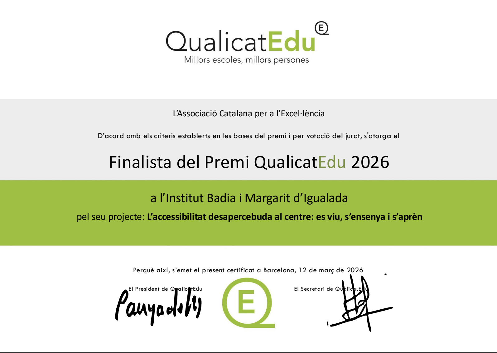 Finalistes del Premi QualicatEdu 2026, amb el projecte internivells “L’accessibilitat desapercebuda al centre: es viu, s’ensenya i s’aprèn”