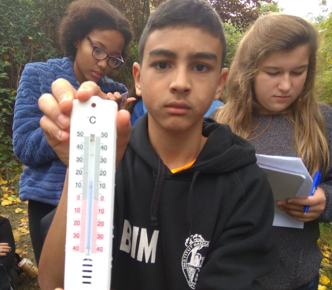 En primer lloc, tothom vam apuntar en un quadern els aspectes a destacar concrets del riu. Primer, vam mesurar la velocitat de l’aigua; per fer això, vam mesurar un metre de riu i llavors hi vam tirar una fulla per veure quant de temps tardava en recórrer-lo. Vam repetir aquest procediment unes quantes vegades i després vam fer la mitjana. La velocitat va ser de 3m/s.
