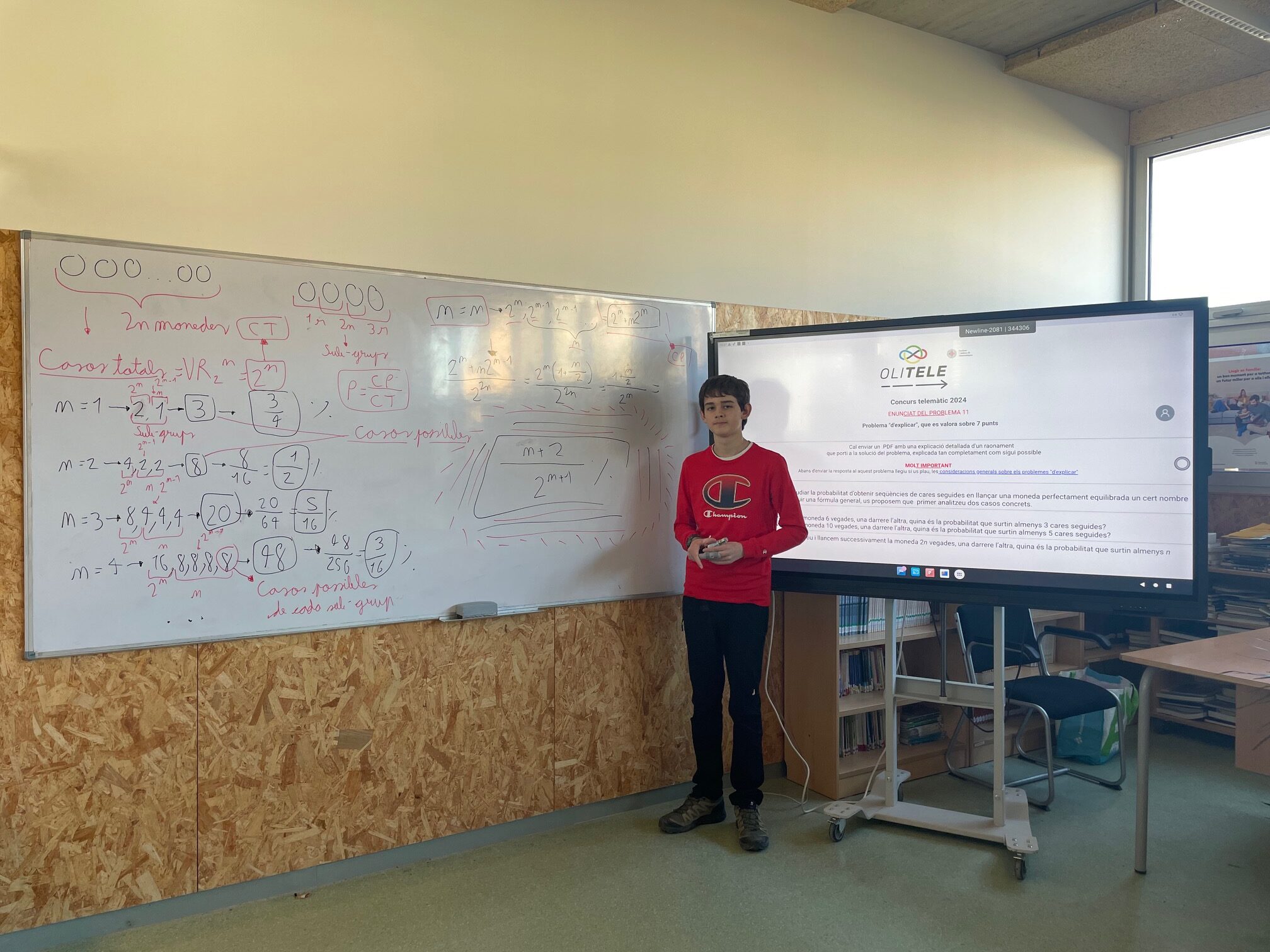 El Roger diu que “el 7demates, l’optativa de matemàtiques d’ampliació i la participació a concursos em motiva molt a fer problemes, reptes, investigar coses de matemàtiques… m’agraden moltíssim, infinit!”. I aquesta passió per les matemàtiques l’ha portat a participar, entre d’altres concursos, a l’Olimpíada matemàtica que va tenir lloc al novembre, “ja sabia que no rascaria gaire bola, però em va agradar moltíssim i continuo pensant en aquells problemes tan difícils…”, diu; i a l’Olitele, un concurs de matemàtiques pensat per al Batxillerat on ha aconseguit una excepcional 12ena posició. El Roger confessa que cada vegada que obria un nou problema no tenia ni idea de per on agafar-lo, però que, “a poc a poc i pensant molt, els vaig treure tots! Això sí, sort que vaig tenir les vacances de nadal… alguns dies vaig estar 4 o 5 hores pensant i investigant problemes, però m’ho vaig passar molt bé! Hi ha qui es passa hores i hores corrent, nedant, llegint… i jo me les passo fent matemàtiques i mirant pel.lícules!”.