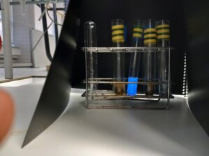 Un dels experiments va ser el d’identificar medicaments per cromatografia. Teníem quatre potets, tres d’ells contenien un principi actiu i el portaven retolat i l’altre era un medicament del qual havíem d’investigar quins dels components anteriors contenia. Per fer-ho, vam utilitzar la tècnica de cromatografia en capa fina, però no era igual que la que faríem en un institut o escola, sinó que la detecció era amb una llum ultraviolada on vèiem com els components s’havien mogut pel paper especial (capa fina) degut a l’afinitat amb la fase mòbil o la fase estacionària.
