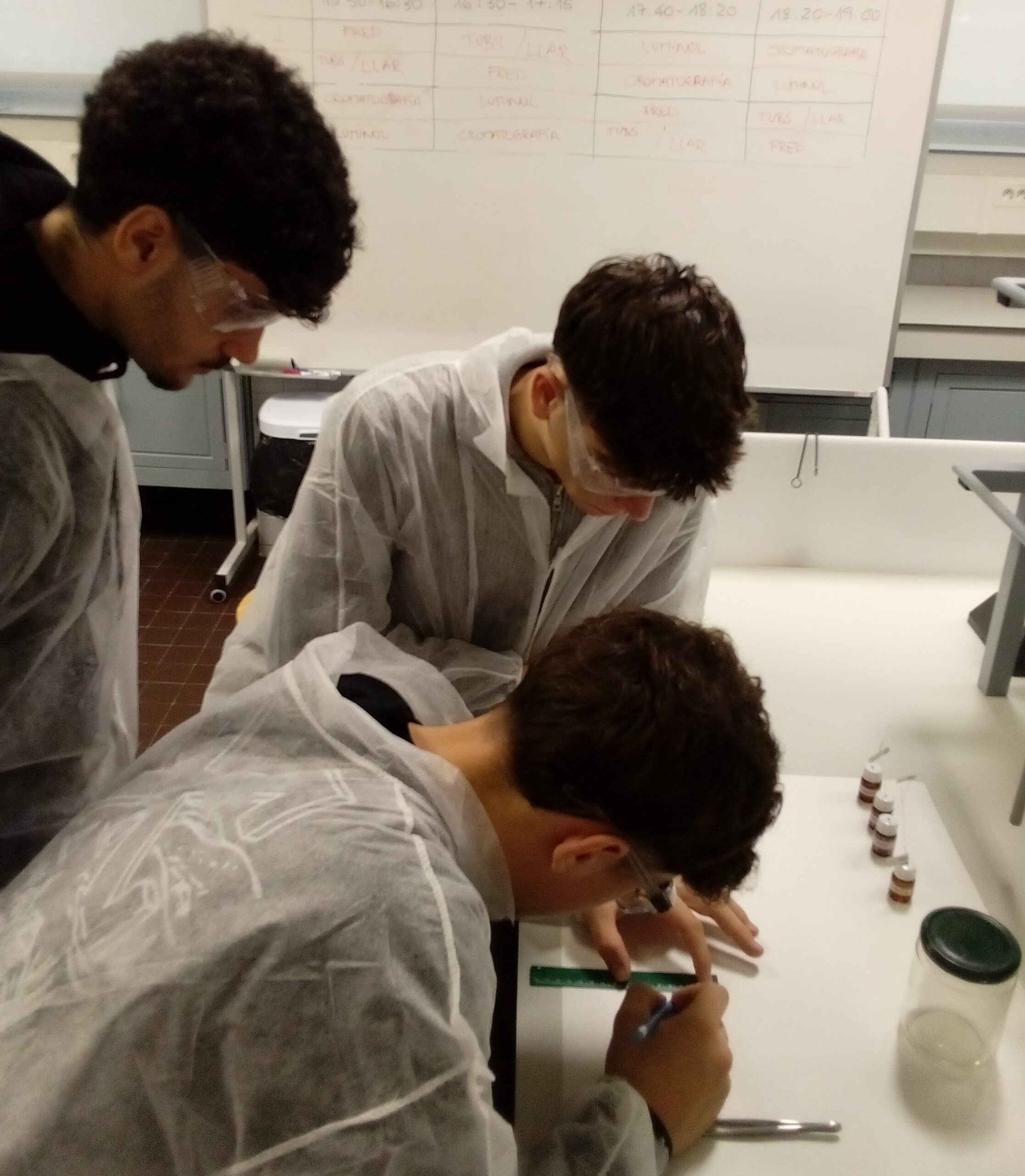 Alumnes de 1r de batxillerat preparant la placa per fer la cromatografia.
