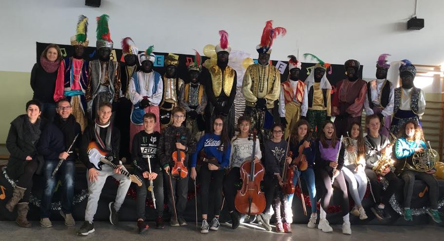 molt d’acord amb el missatge que les tres exalumnes de l’escola Dolors Martí que ara fan 1r d’ESO havien esbossat per al patge Domab, perquè els patges coneguessin encara millor l’escola i poguessin parlar als nens i nenes amb bon coneixement de causa. El dimecres 19 de desembre, al matí, la banda de músics de 2n ESO es va unir al cel.lo de 1r d’ESO i a un grup de músics de l’escola Dolors Martí i sota la direcció del Pepe i l’acompanyament musical de la Mariona van interpretar l’himne del patge Faruk quatre vegades: a l’entrada i a la sortida de l’acte d’infantil i a l’entrada i a la sortida de l’acte de primària. El patge Domab va patir una indisposició d’última hora i el va haver de substituir un ja no tan petit patge, però això, els nens i nenes de l’escola, ni ho van notar.
