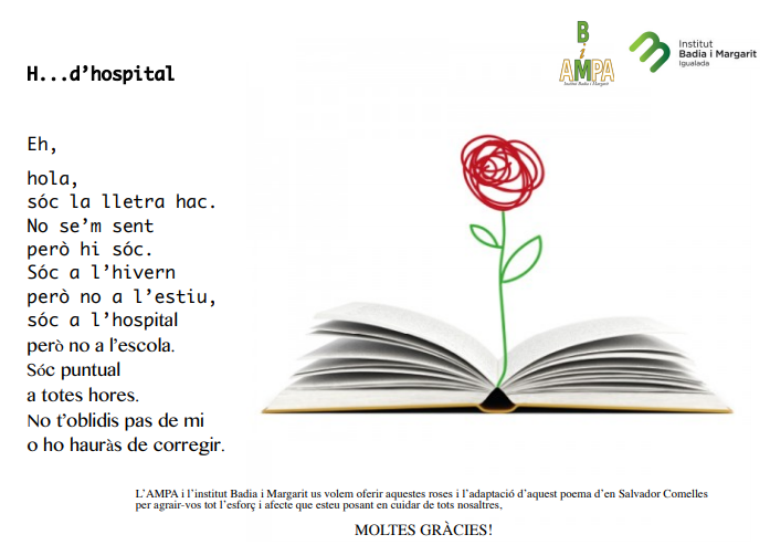 En una diada de Sant Jordi més especial que mai, l’AMPA, en nom de tota la comunitat educativa del Badia i Margarit, ha regalat les roses de Sant Jordi que havien de vendre els alumnes de 4t ESO a l’Hospital d’Igualada, com a mostra de suport i agraïment per tota la tasca que estan desenvolupant.