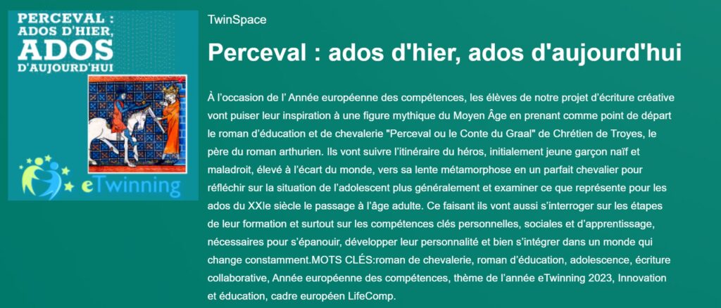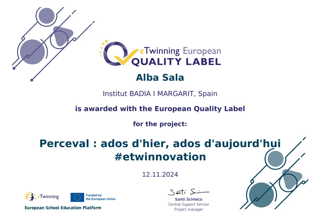 Un curs més, el projecte eTwinning d’escriptura creativa en francès elaborat pels alumnes de 4t d’eso del curs passat, ha estat reconegut amb el segell de qualitat europea. Ha sigut un projecte que ha permès treballar amb d’altres instituts europeus, amb els quals ja estem habituats a treballar. A més a més, ens ha permès conèixer l’obra de Perceval.