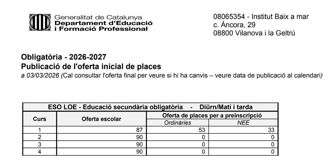 Publicació de l’oferta inicial de places ESO admin03/03/26 Publicació de l’oferta inicial de places ESO LOE 2026-2027