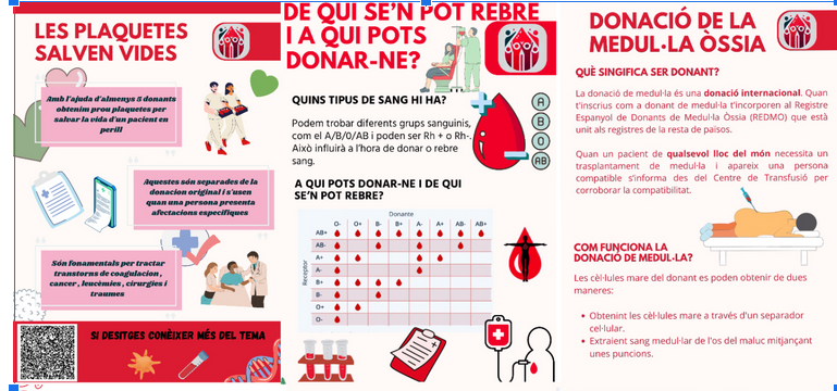 A part d’aquests cartells que s’han utilitzat per fer-ne la difusió cada any, l’alumnat també n’ha fet uns pòsters divulgatius amb els quals han anat adquirint tot el coneixement sobre la sang del nostre organisme. Han après des de qui pot donar sang i qui no, qui en pot rebre, els diferents tipus de sang que hi ha, els requisits bàsics per donar-ne, casos que poden impedir la donació, quantes vides pot arribar a salvar una sola donació, què és el plasma, les plaquetes, els hematies, com funciona la donació de la medul·la òssia i quina és la importància del seu trasplantament…