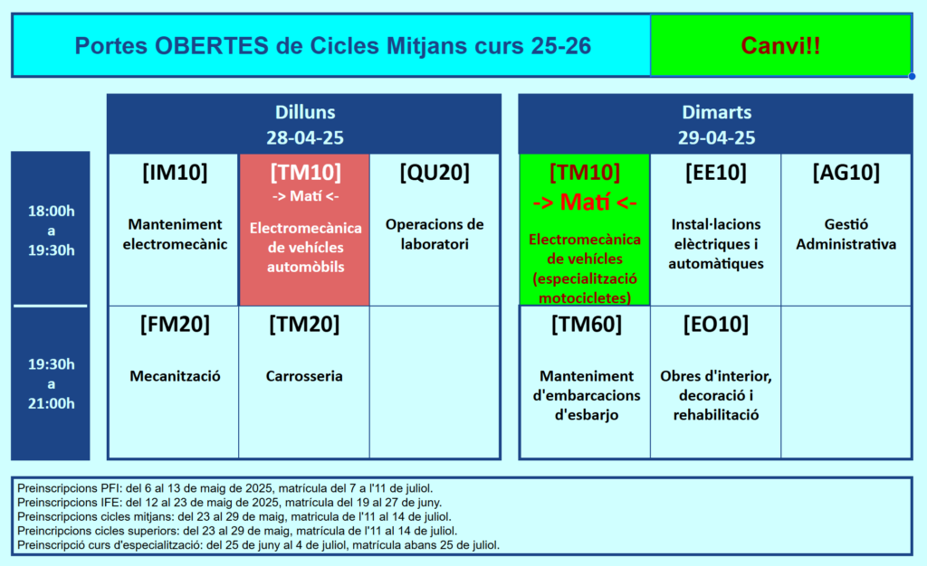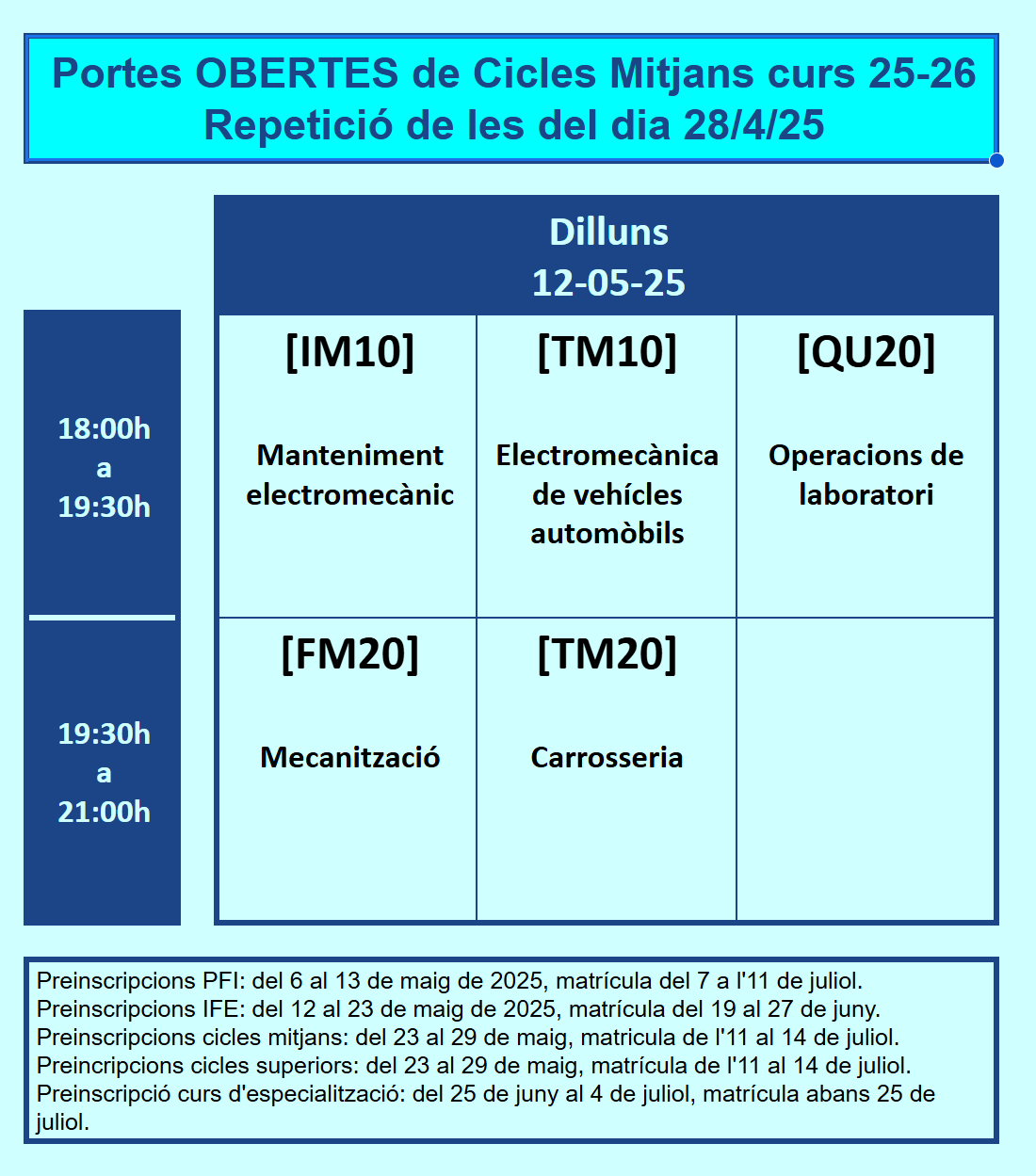 Tot seguit trobareu les dates i horari de les portes obertes que organitzem per mostrar-vos tota l’oferta de l’INS Miquel Biada de formació professional: PFI, IFE, curs d’especialització i cicles formatius. Us animem que veniu a conèixer el nostre projecte educatiu, les nostres instal·lacions i l’equip docent que acompanyarà els vostres fills i filles en aquesta nova etapa.
