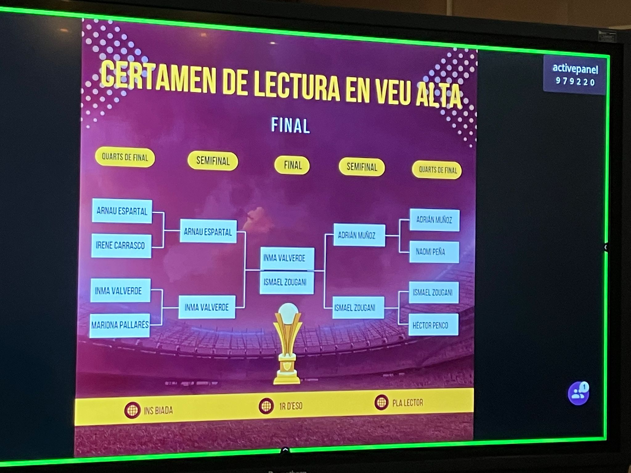 El passat divendres dia 16 de juny l’alumnat de 1r d’ ESO va participar en la gran final del certamen de lectura en veu alta de l’Institut. Una activitat que s’ha desenvolupat durant tres setmanes i consistia en millorar la lectura en veu alta que era un dels objectius a assolir dins del Pla Lector d’enguany. A la final van participar per votació del professorat i de l’alumnat els vuit finalistes d’entre els tres grups: Arnau Esparta, Irene Carrasco, Inma Valverde, Mariona Pallarès, Adriàn Muñoz, Naomi Peña, Ismael Zougani i Héctor Penco. Volem felicitar-los a tots ells i elles per la seva gran implicació i participació i per descomptat a la gran finalista que va ser l’Inma Valverde.