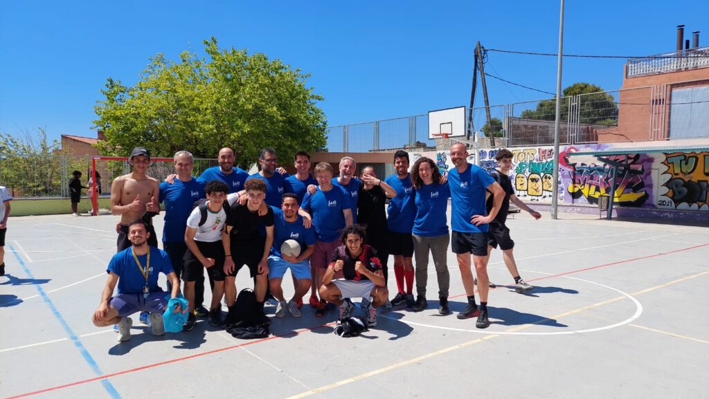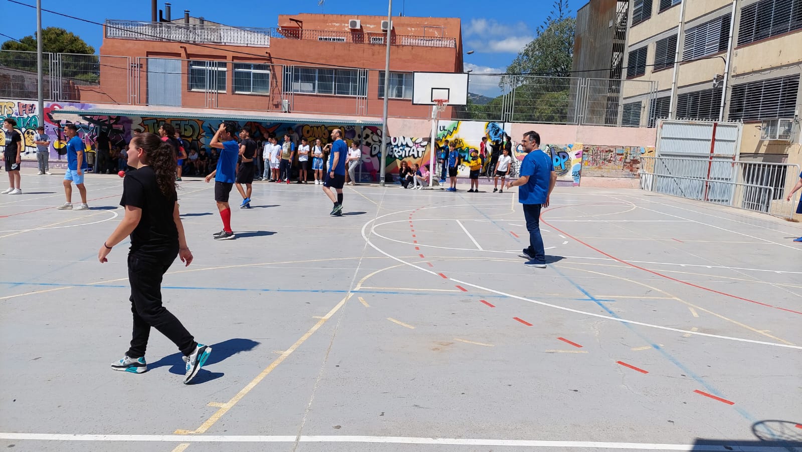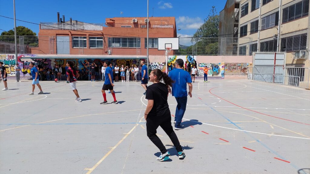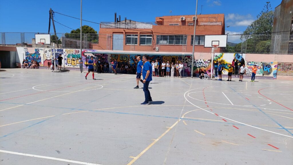 El pati estava ple de gom a gom. L’alumnat d’ESO esperant el partit alumnes profes. Professorat i alumnes animant i cridant cada vegada que hi havia una ocasió de gol. La Salma va marcar per part dels alumnes i Omar BenMusa va empatar el partit per part dels profes. Invasió de camp, cridòria i alegria desbordada. Va ser un matinal de futbol i d’espectacle on alumnat i professorat vam passar tots plegats una molt bona estona.