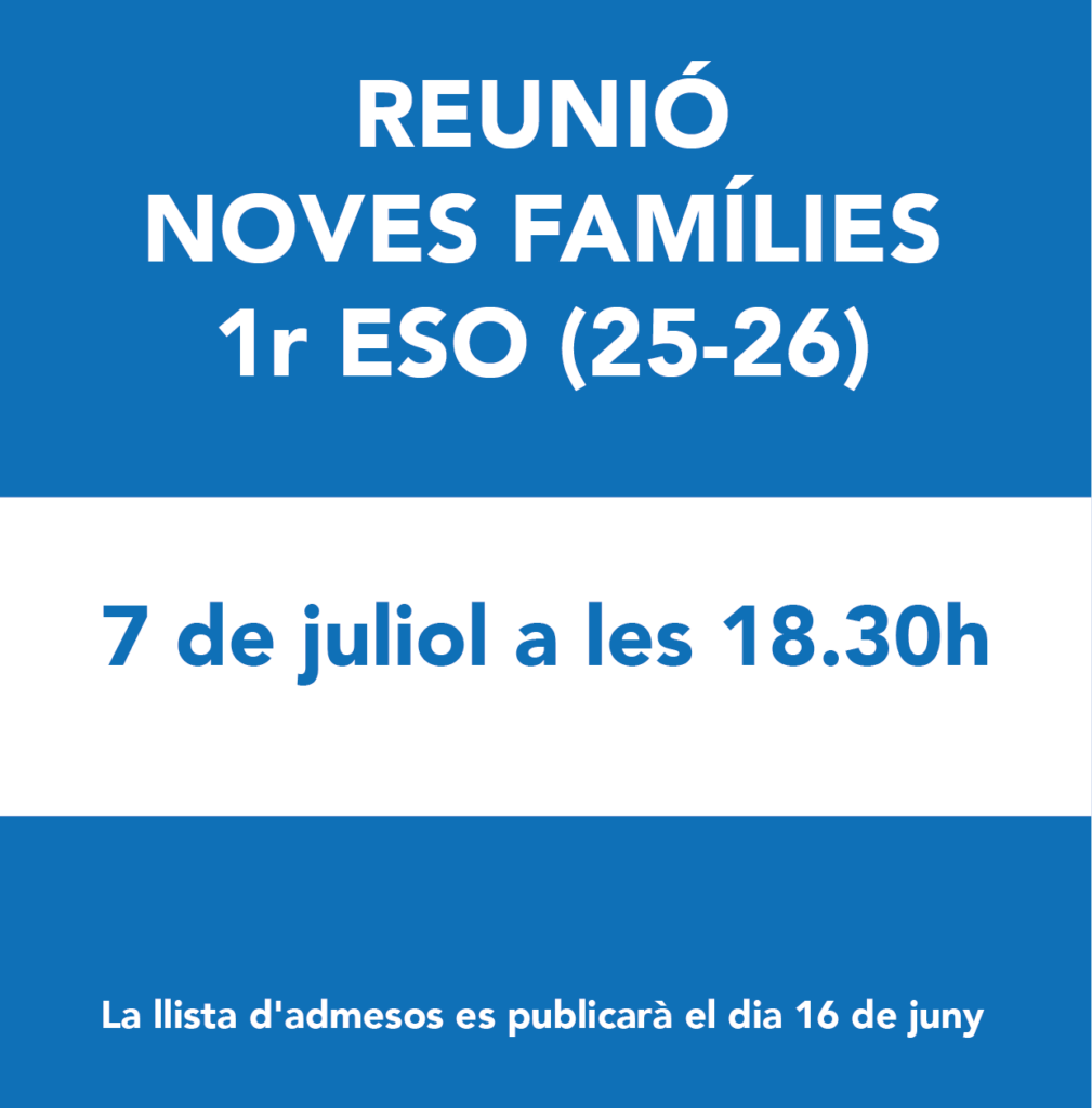 REUNIÓ NOVES FAMÍLIES 1r ESO (25-26) Comissió Imatge07/07/25 Reunió amb les famílies de l’alumnat que farà 1r d’ESO el curs 25-26. Dilluns 7 de juliol a les 18.30h. Llista d’admesos el 16 de juny