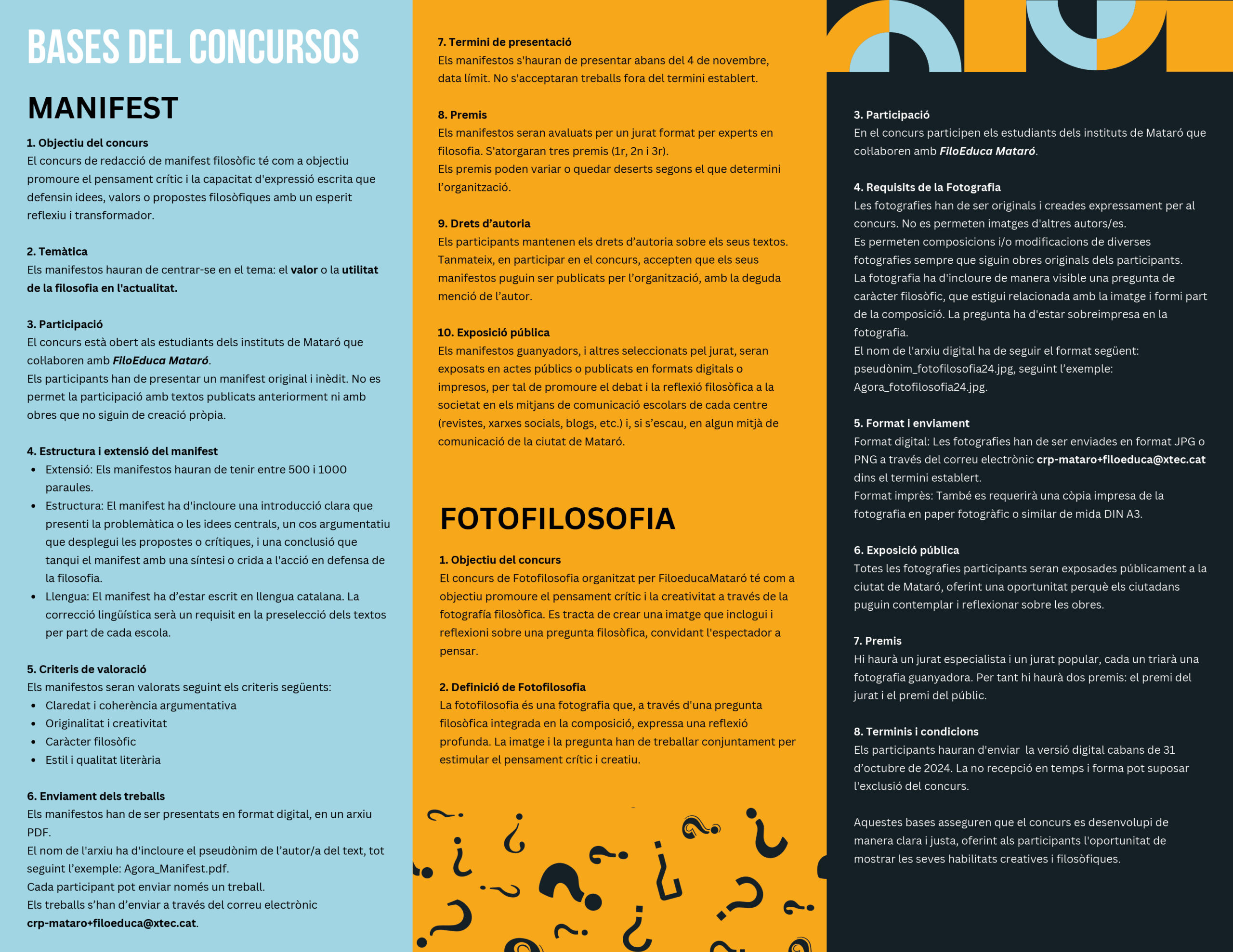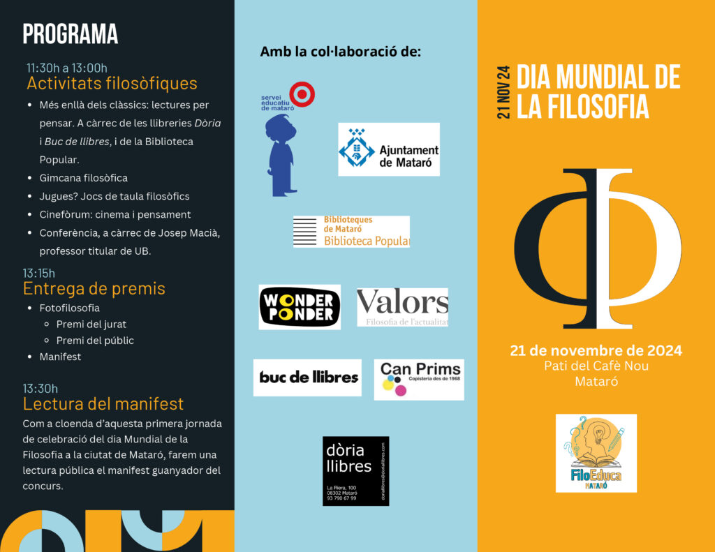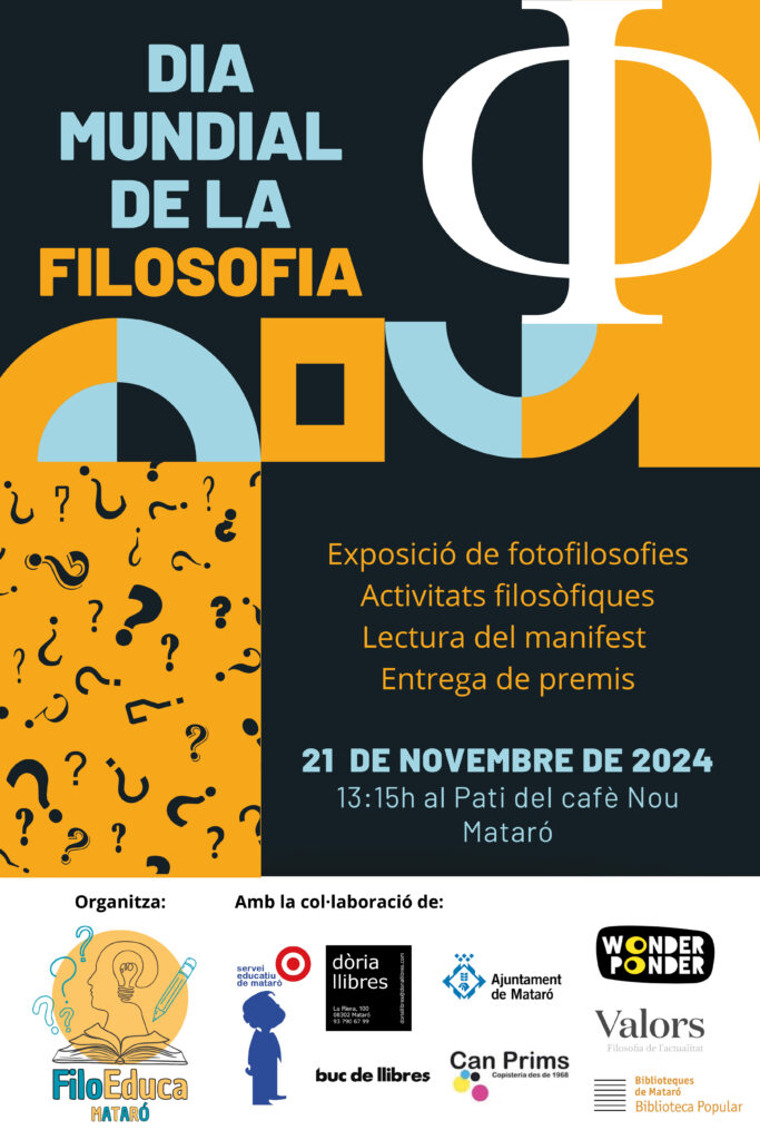 Avui dijous 21 de Novembre celebrem el Dia Mundial de la Filosofia a la ciutat de Mataró. De la mà de Filoeduca Mataró, un grup de professores filòsofes de la ciutat de Mataró que volen treballar i compartir experiències per millorar l’ensenyament i aprenentatge de la filosofia. Els alumnes de primer de batxillerat de l’Institut Miquel Biada – membre de la organització de Filoeduca Mataró-, participaran en una jornada lúdica educativa, on podran gaudir d’activitats filosòfiques diverses, a més de participar en un concurs al millor Manifest Filosòfic i a la millor Fotofilosofia. Els premis seran entregats demà, al finalitzar la jornada, a les 13h al Pati del cafè Nou, al centre de la ciutat, on es farà també la lectura pública del Manifest guanyador, esteu convidats. No dubteu a participar d’aquest dia amb nosaltres. En l’Instagram de filoeducamataró us expliquem com, quan i on!