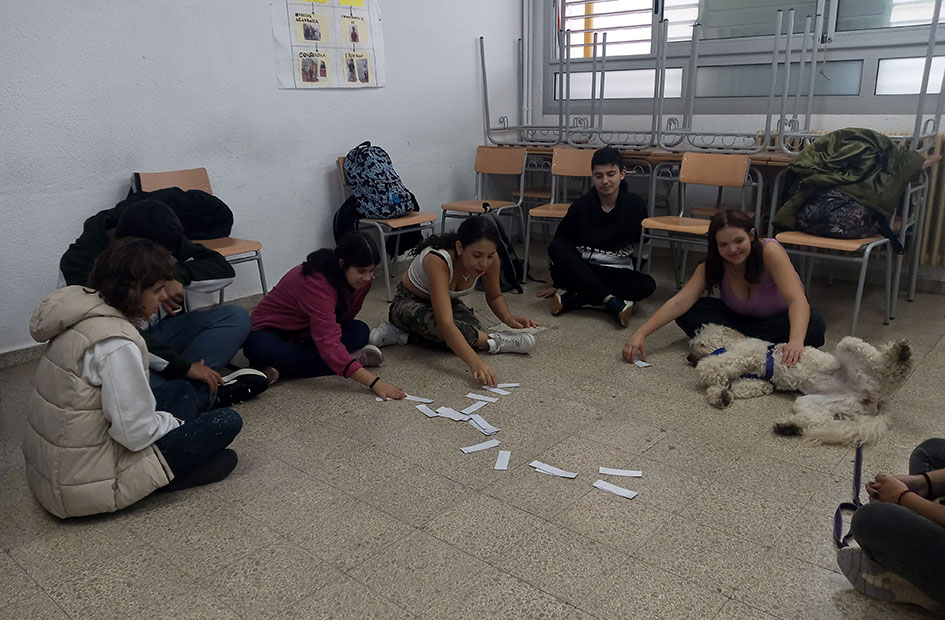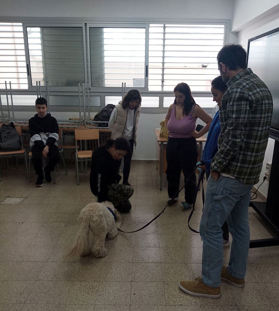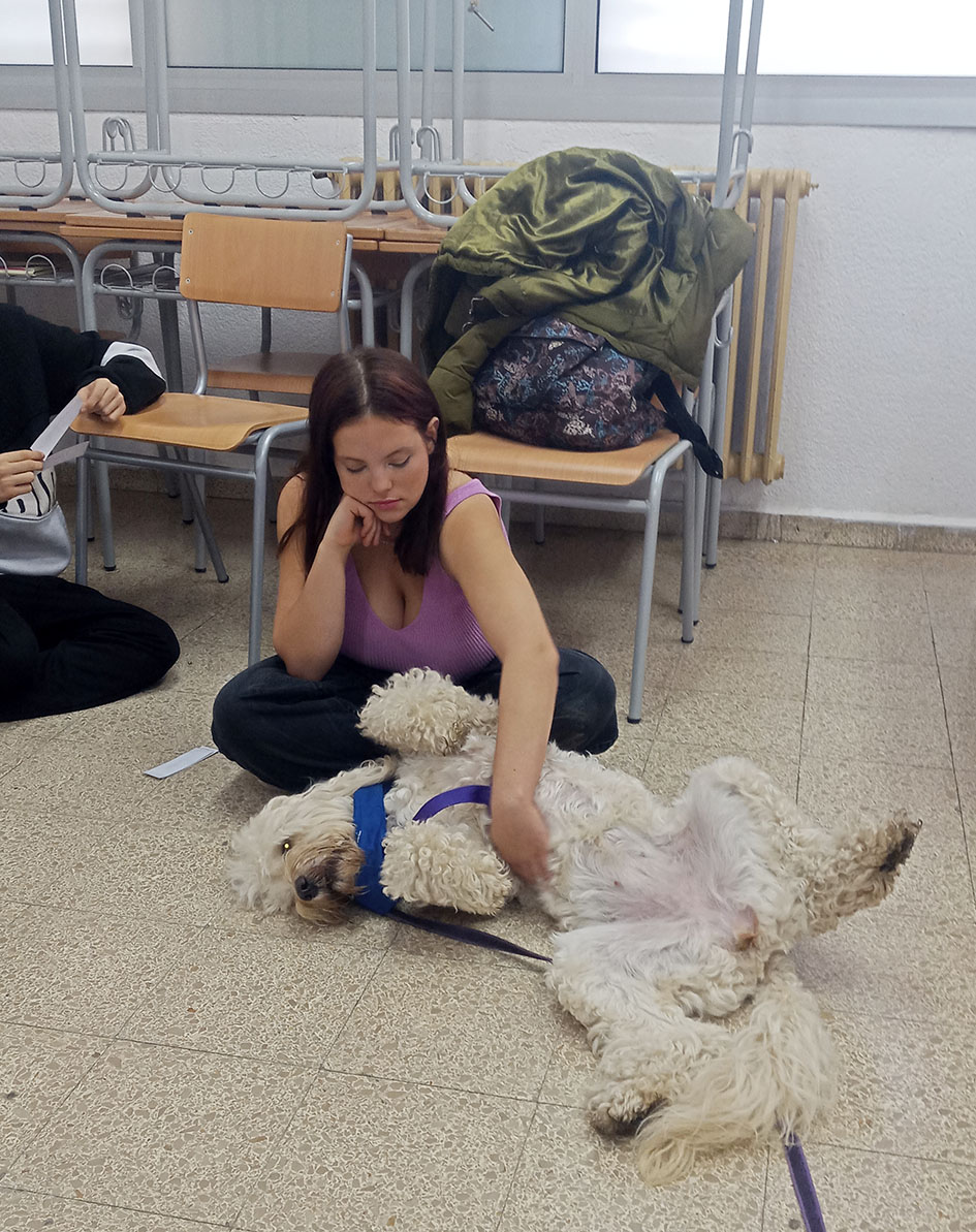 L’Iris ha arribat a l’aula ensumant els racons, però de seguida s’ha assegut còmodament al costat de l’alumnat demanant tota mena de carícies. La Lucía ha estat l’encarregada de començar a amanyagar-la, tot i que de seguida altres companys s’hi han apropat. Fins i tot, la Janke ha estat capaç de fer front a la por i ha aconseguit donar-li menjar. Ha estat un esforç per ella.