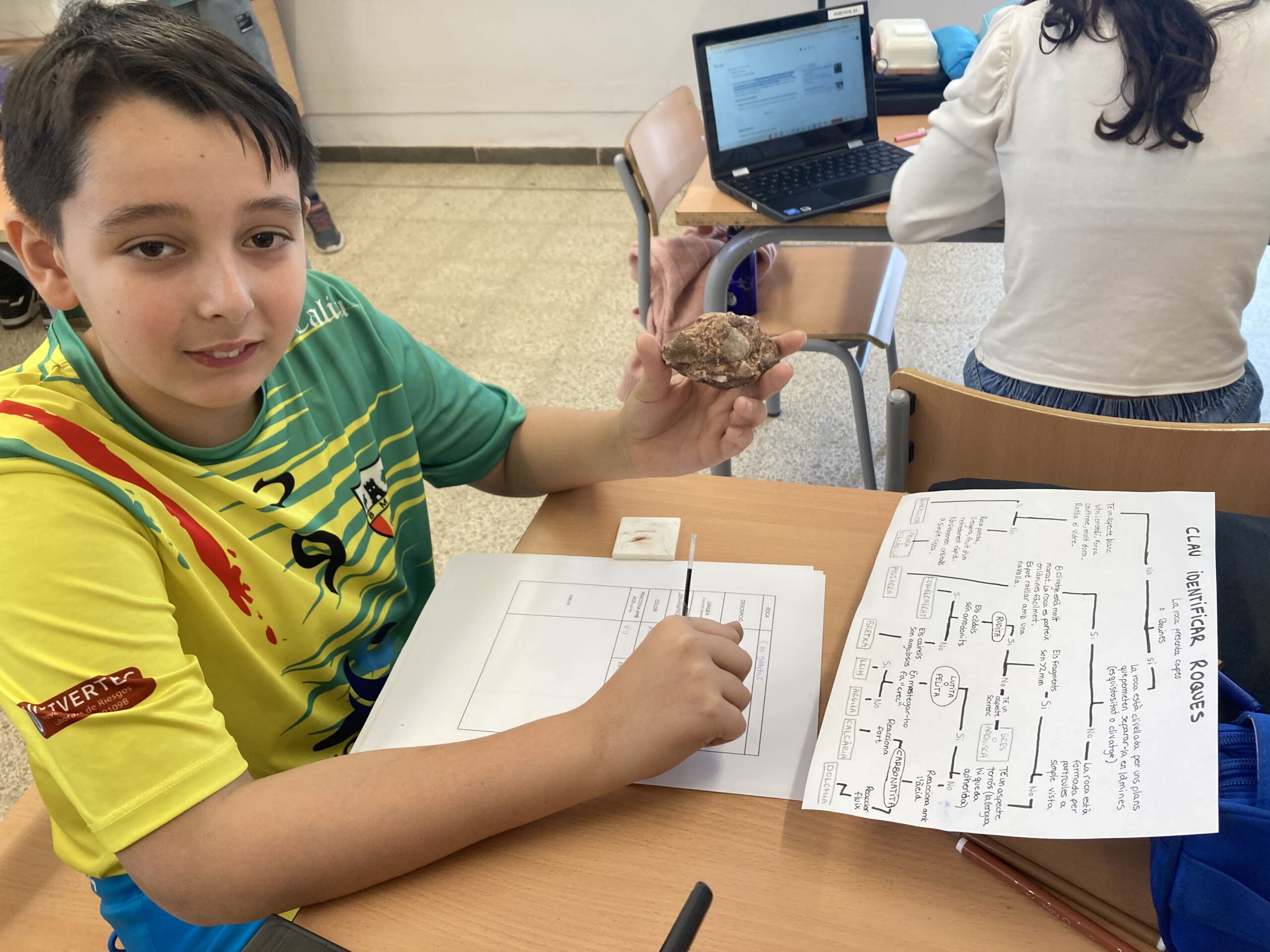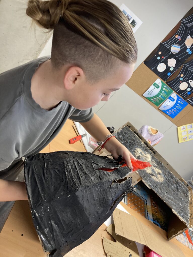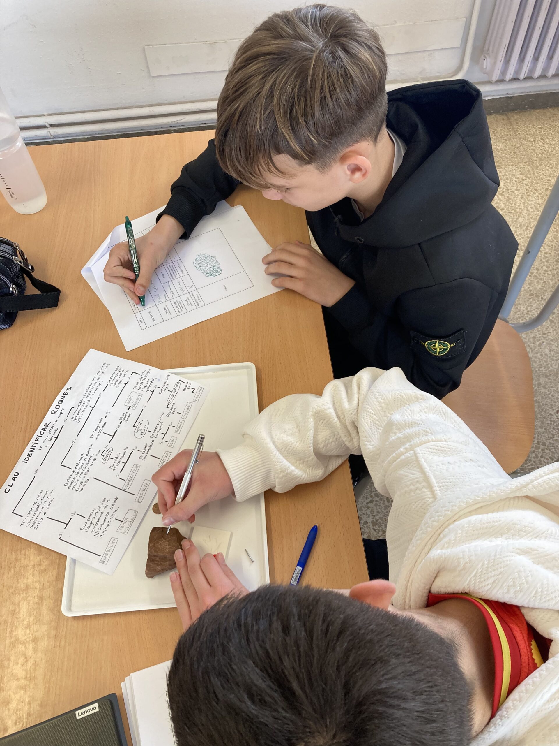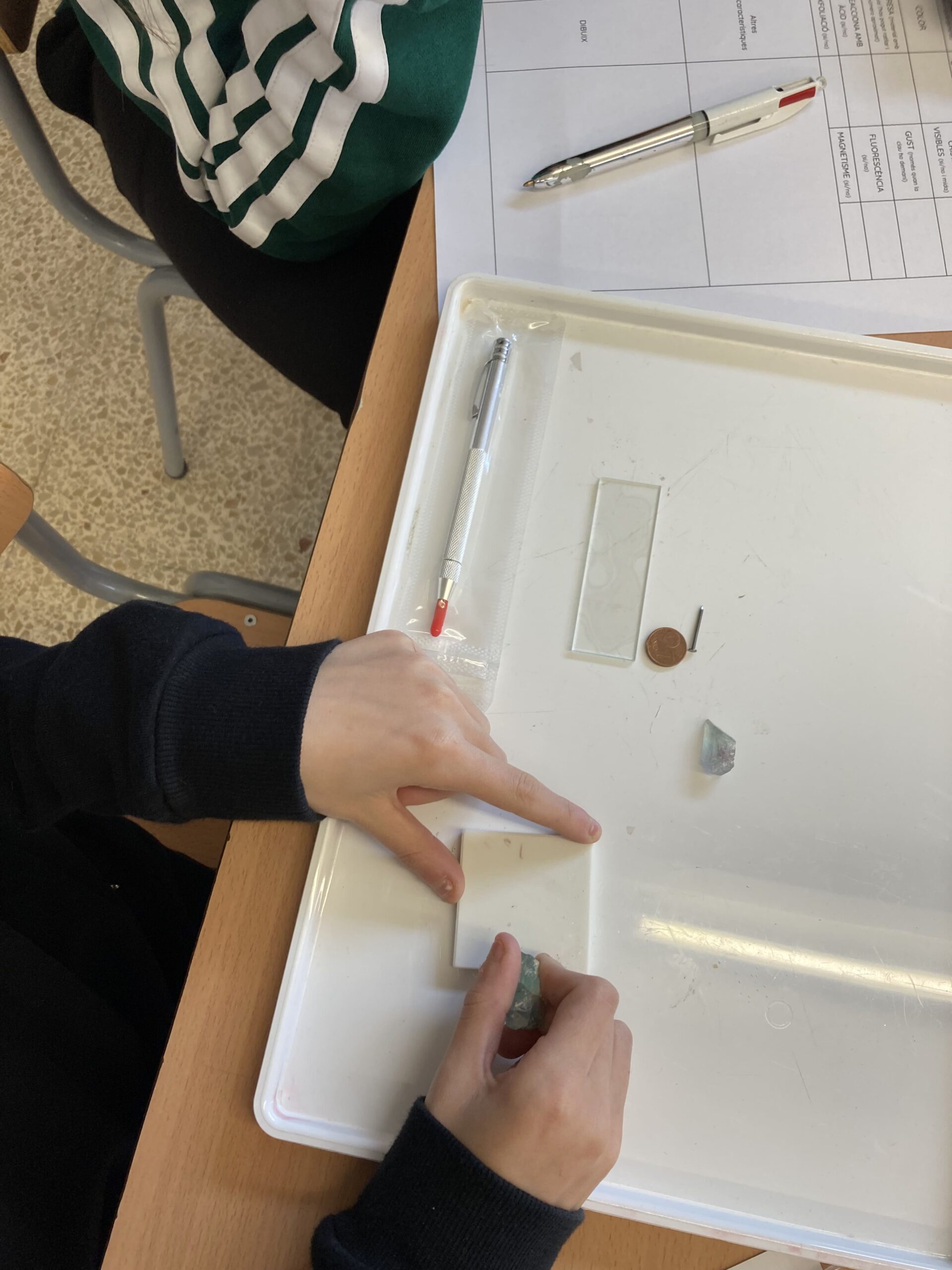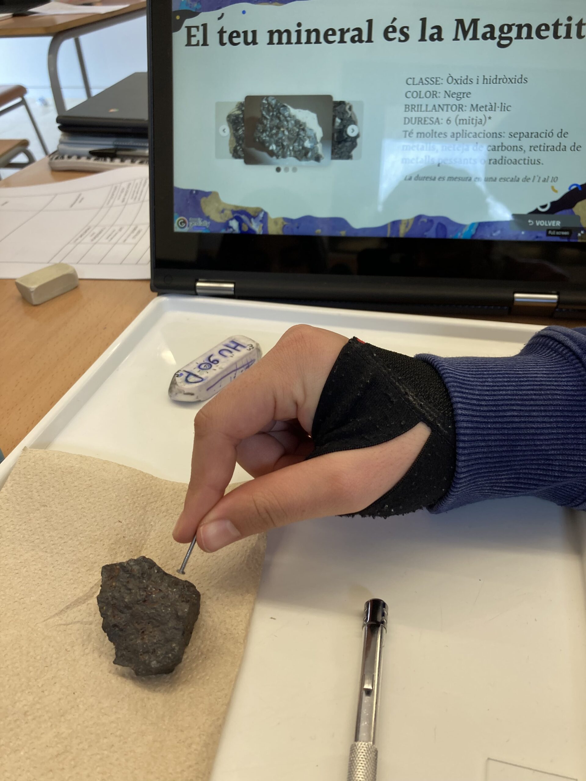 A l’EG3 “Roques i Minerals”, vam investigar el nostre planeta, descobrint les diverses capes, els processos geològics interns i externs, alguns minerals, i la diferencia entre roca i mineral. Unes de les tasques que vam fer va ser “el forat”, una activitat que dibuixem un forat des del pati de l’institut, fins al nucli de la terra. La van fer al principi del tema sense saber res i després, quan ens vam fer experts, la vam repetir.