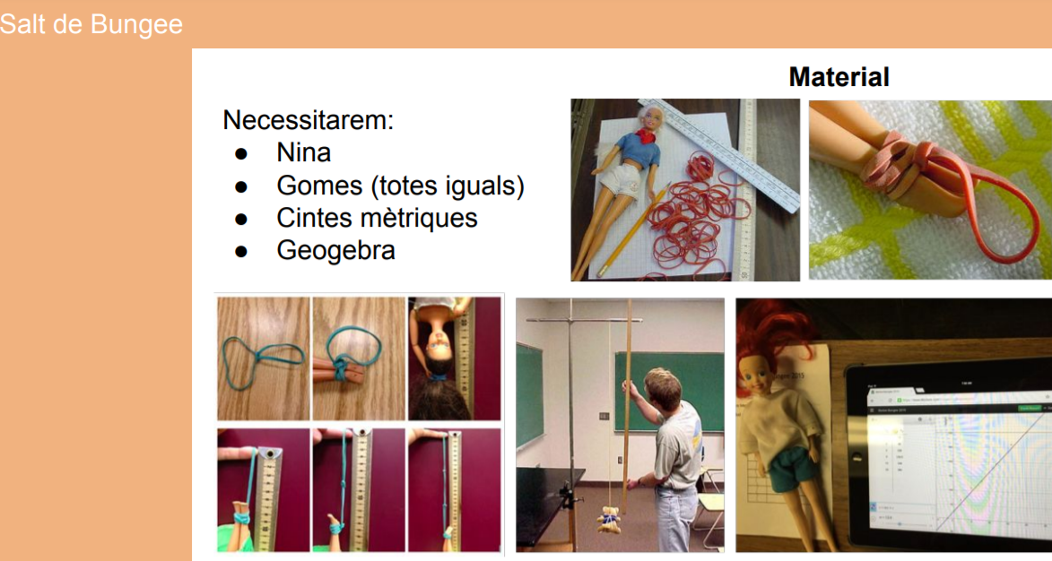 Dins de l’estudi de les representacions gràfiques a 2n de l’ESO ens hem plantejat quantes gomes elàstiques deuria utilitzar un saltador o saltadora per poder fer un bungee, una mena de puenting, sense obrir-se el cap.