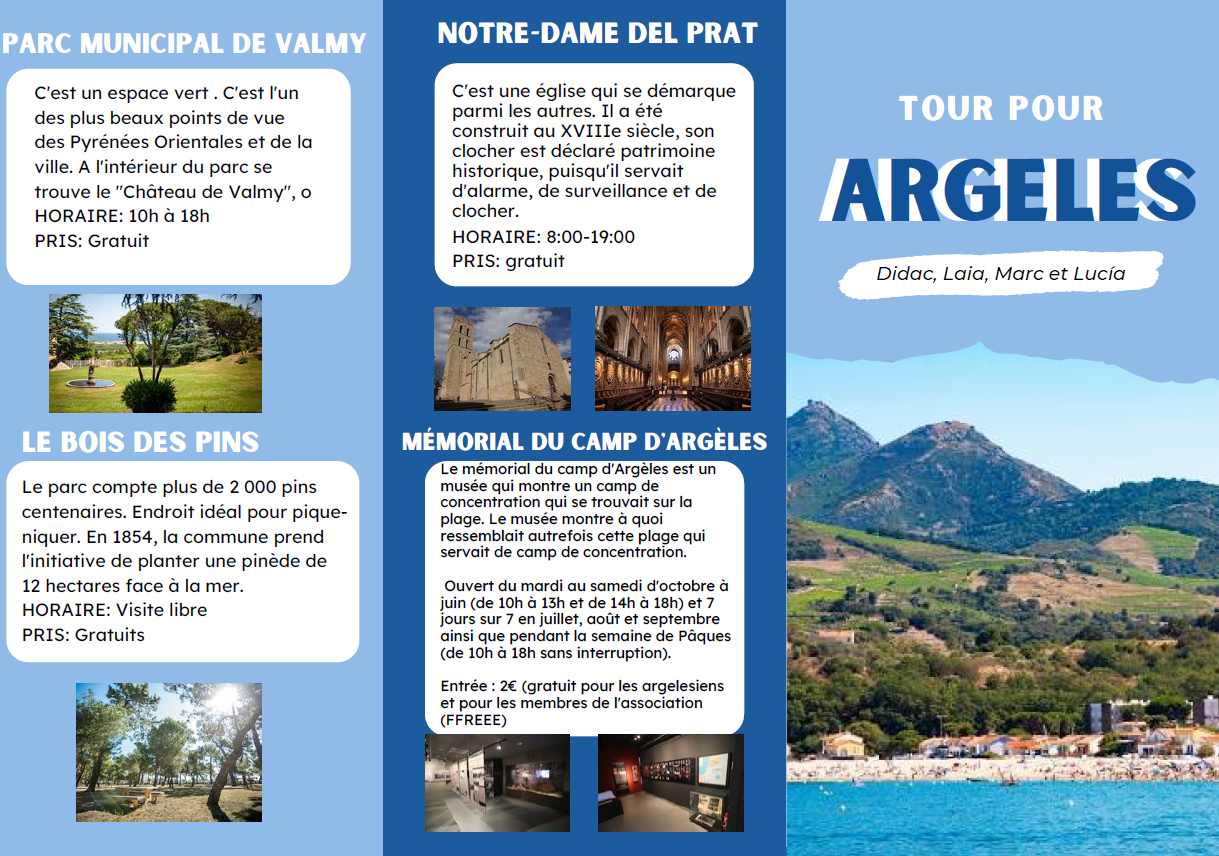 Finalment, hem creat la nostra ruta per Argèles, creant un tríptic turístic amb els diferents espais, explicant què és, quan es pot visitar i el preu de la visita. Us deixem alguns exemples: