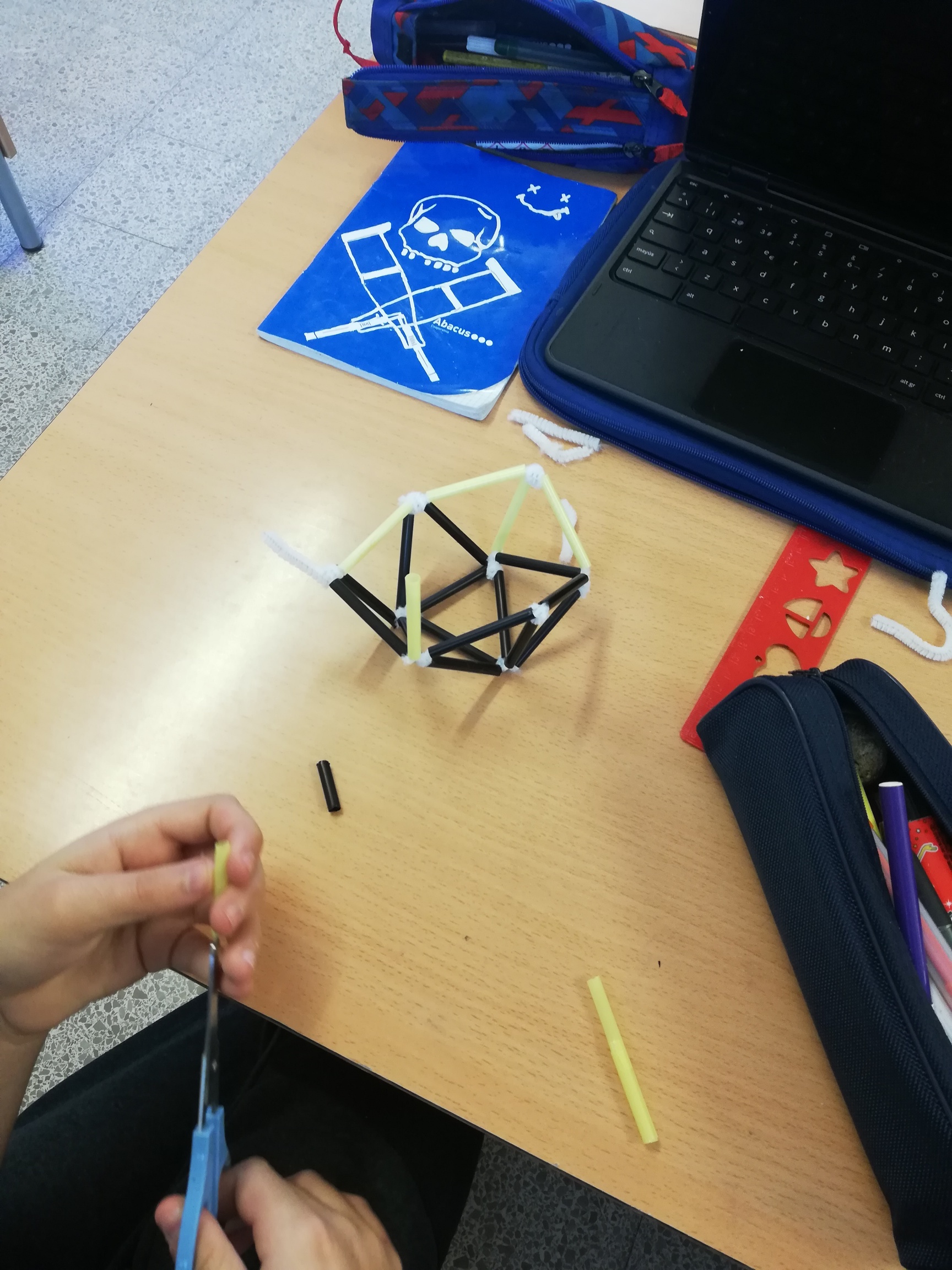 En la segona meitat del trimestre hem treballat els poliedres, principalment els sòlids platònics, des de varies vessants. Vam començar l’ús de l’eina informàtica Geogebra per a la creació virtual d’aquestes figures per a continuació fer el salt abstracte a llenguatge matemàtic del volum i superfície en tres dimensions. I per acabar, hem dedicat esforços a la creació real i manipulativa dels diferents sòlids platònics que decoren la classe durant aquests dies.