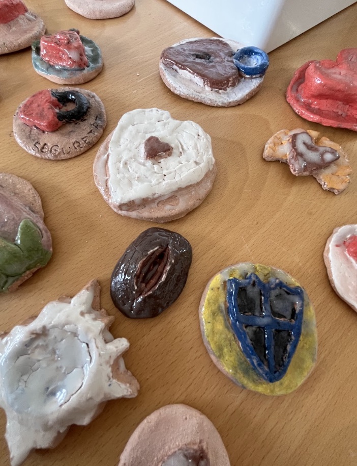 Hem traslladat tot aquest coneixement en un mural ceràmic en el qual hem experimentat amb les textures i els relleus que han donat forma a la nostra visió de les sexualitats, un món que s’experimenta des del respecte a traves dels sentits i amb molta cura a nosaltres mateixes i a la resta. Primer de tot vam fer un esborrany cadascun per tenir clar el que volem representar al mural. Després vam haver de fer dos dibuixos per posteriorment passar-lo al fang i amb aquests dibuixos vam fer un pin i els vam pintar. Per tenir la idea principal del mural vam ajuntar totes les idees nostres i també vam decidir quins elements més importants per representar al mural. I així és com vam tenir el mural.