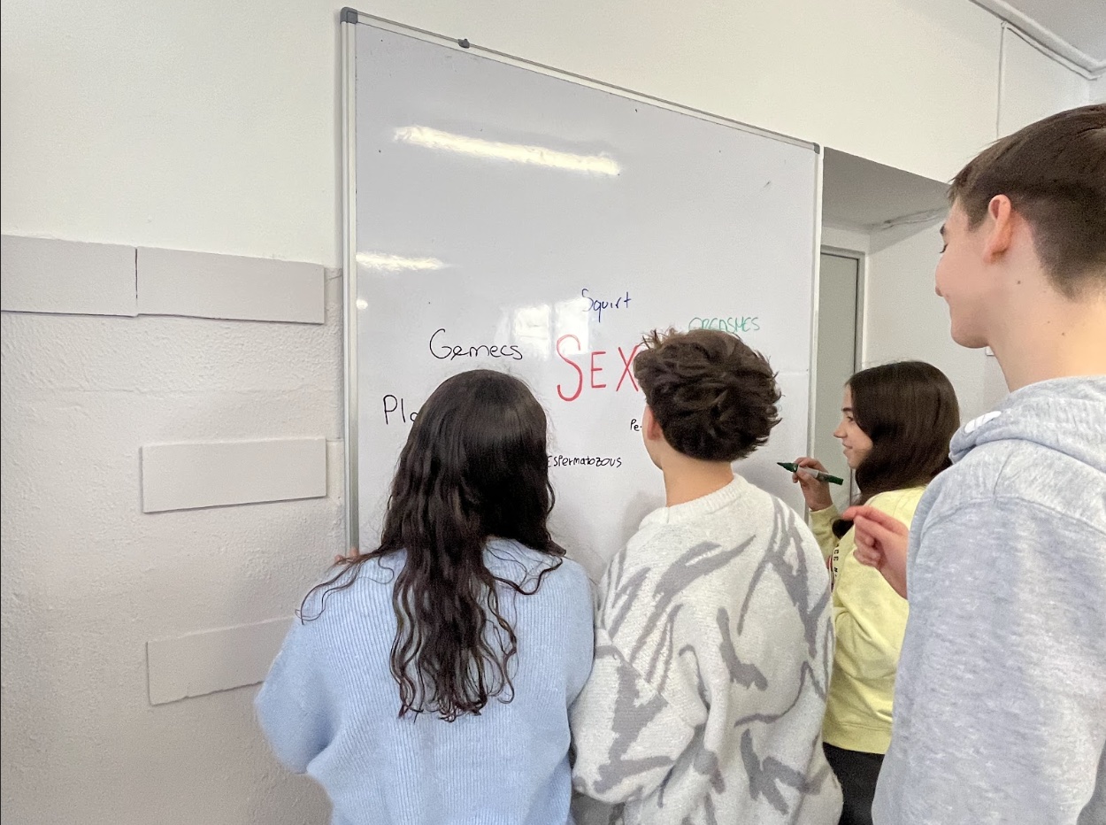 La nostra professora ens va repartir uns llibres per anar fent les tasques a mà i no fer-les a Chromebook. Una de les primeres tasques que vam fer va ser posar paraules que ens venen al cap quan sentim la paraula “Sexe”, algun es paraules de les que vam posar van ser: petons, penis, amor, mirades, connexió…