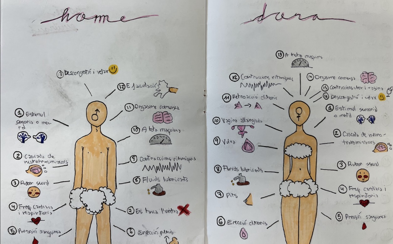 En el primer tema parlàvem dels temes de la sexualitat, vam veure uns vídeos que sortien unes persones que explicaven les seves experiències del que els havia passat. Per exemple, la experiència d’un noi trans en entrar al vestidor de noies i com elles van reaccionar. En el segon tema vam parlar del que passava al cos dels adolescents, la pubertat, bàsicament els canvis que hi ha quan vas creixent. Vam parlar de l’anatomia dels aparells reproductors humans. Seguidament vam parlar de: Que es l’excitació?. Amb aquestes preguntes vam respondre a com ens excitem les persones, i depèn del sexe, alguns s’exciten més ràpidament, uns altres més lents, uns d’una manera i uns altres d’un altre.