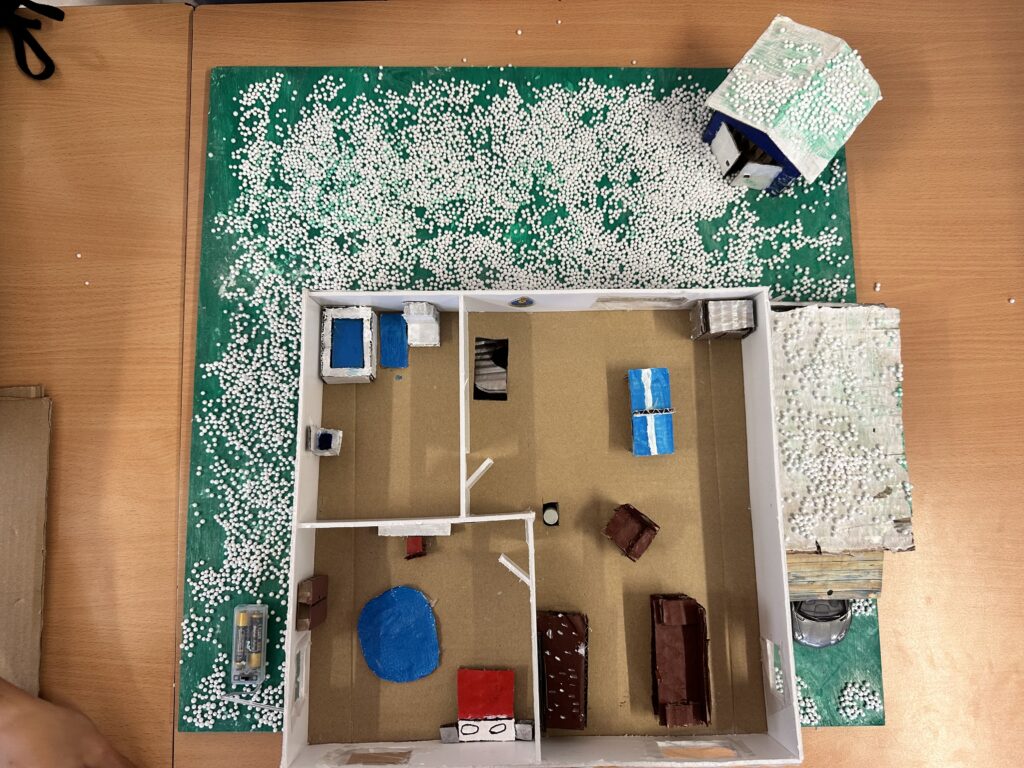 Després de fer totes aquestes classes, ens vam posar ja a fer la nostra maqueta del futur, en escala. Posant parets i mobiliari, també a algunes maquetes vam posar un circuit elèctric, perquè la casa pogués haver-hi llum, led. També gràcies als alumnes de quart, ens van fer un circuit amb una micro:bit amb la que vam poder posar elements elèctrics, com portes que s’obrien soles. Finalment, vam crear un pòster A2 amb tot el procés i ens van venir dues arquitectes de la ONG Arquitectura sense fronteres per poder avaluar la nostra maqueta i dir-nos alguns consells.