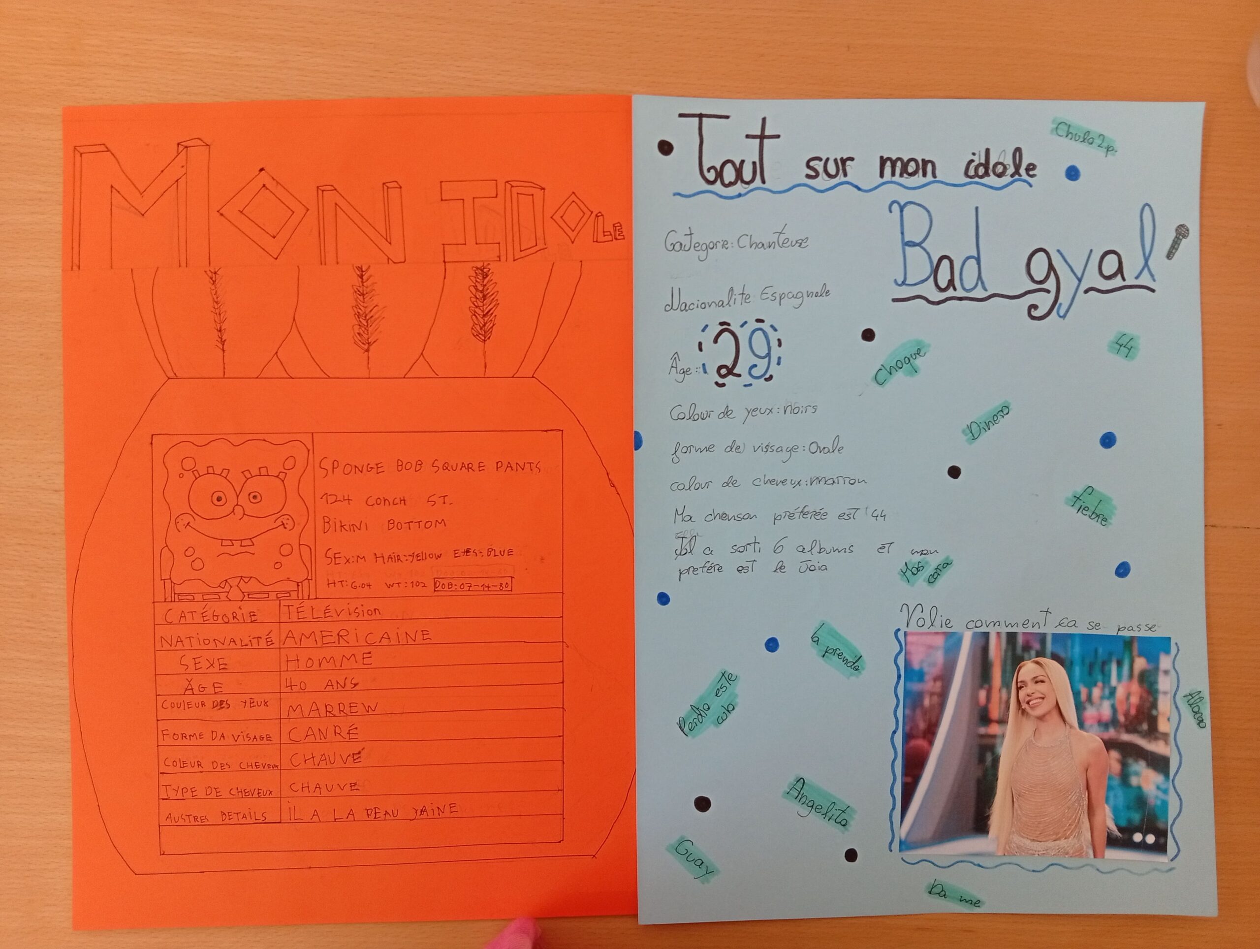 En el següent tema, “Mon Idole”, hem treballat les descripcions físiques i aparences, també el caràcter i molt vocabulari i gramàtica sobre els  hobbies, i el gènere dels adjectius, a més dels verbs acabats en -ER. La tasca final va ser molt xula: cadascú va triar el seu ídol i vam fer una descripció d’ell, amb les informacions següents: característica, forma de la cara, color i forma del cabell, color d’ulls, edat, sexe i altres característiques.