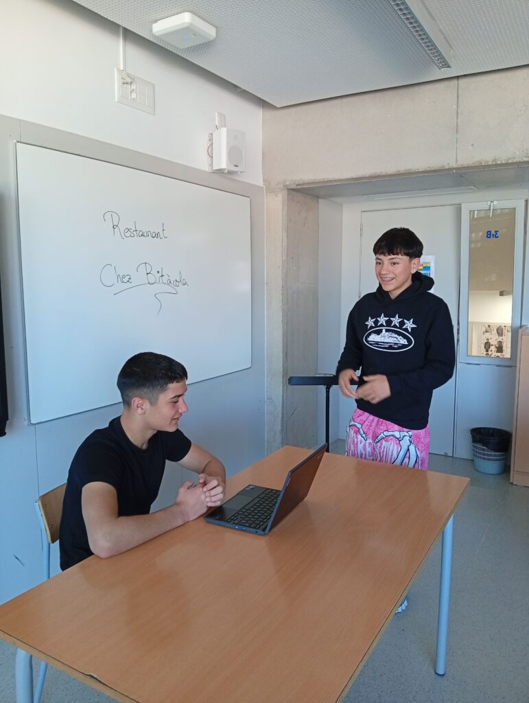 Per al segon tema, que es diu “Voyage! Voyage!” l’alumnat ha estat treballant vocabulari per quan anessin a França, concretament vocabulari per parlar, comprar i demanar productes a les botigues. El tema va començar amb els mitjans de transport, perquè l’alumnat pugui identificar-les i utilitzar-les a França. El següent tema es va centrar en demanar coses, per quan l’alumnat necessiti anar a una botiga per comprar, destacant el vocabulari per demanar reserva en un hotel i el vocabulari per menjar en restaurants. Per tancar el tema, vam fer dues tasques: en una vam fer un “simulacre” d’un mail a un hotel per reservar allotjament i en una altra, la tasca final, vam fer un role play en parelles on vam simular una escena en un restaurant, una persona era el client i l’altre el cambrer.