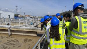 En acabar el taller, l’alumnat va començar la visita per les instal·lacions, i veure el que l’educadora havia explicat anteriorment. La primera parada van ser els “cargols d’Arquímedes”, on fan elevar l’aigua i també es filtren les impureses grans gràcies al desbast. Després van anar al dessorrador i desgreixador, on s’extreuen les sorres i els greixos. A continuació van veure el decantador primari, on s’extreuen els sòlids que no s’han pogut eliminar. A l’acabar, van passar pel reactor biològic, on la matèria orgànica es converteix en “fangs” amb l’ajuda de bacteris. Per finalitzar, van anar al decantador secundari, on se separen els bacteris de l’aigua.