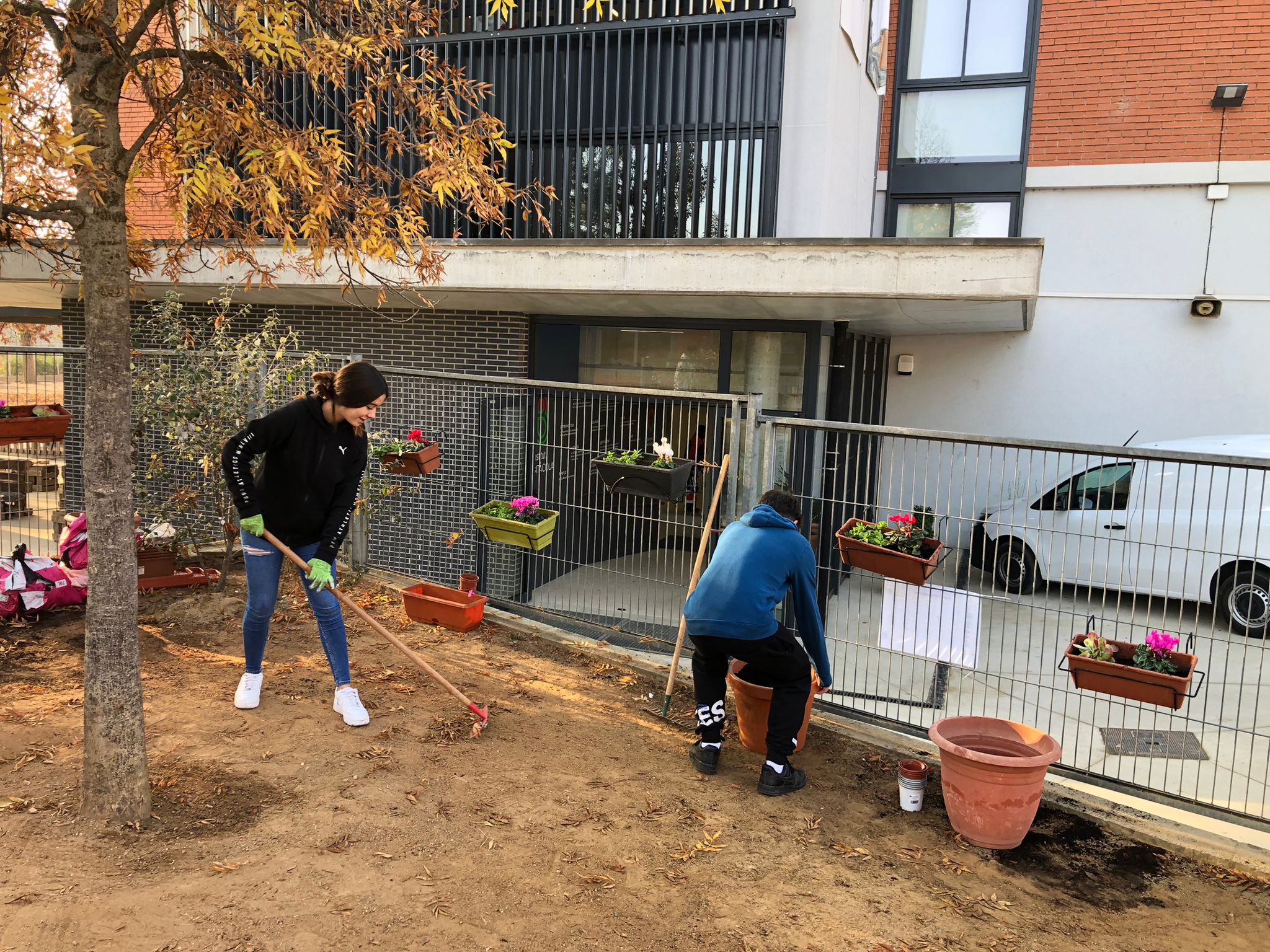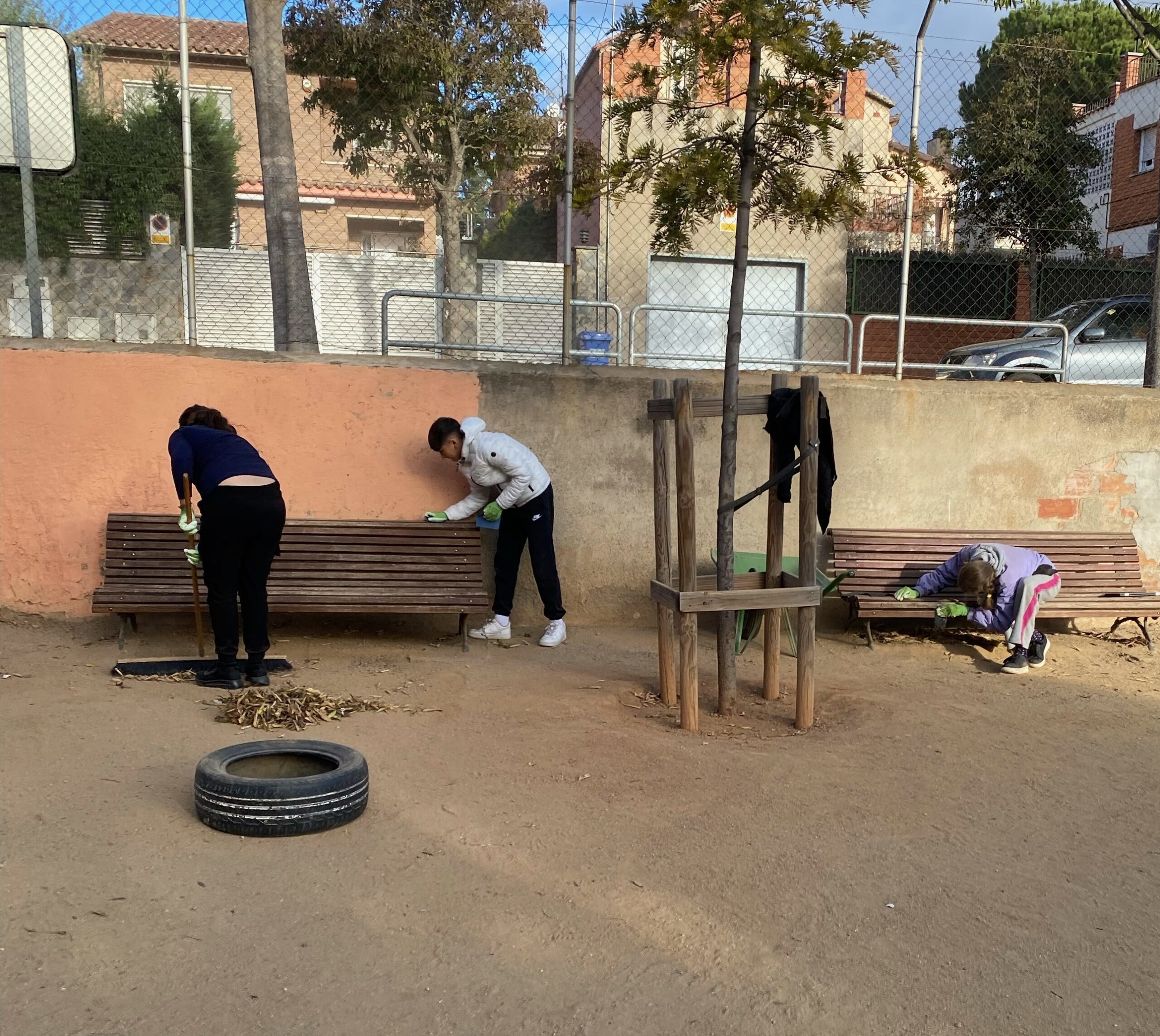 Per fi va arribar el dia de baixar al pati. Tothom tenia moltes ganes del primer dia i el que vam fer va ser: escombrar totes les fulles i brutícia que hi havia i agafar les recomanacions del Sadu, Ell venia cada dimecres, i alguns divendres, a ajudar-nos, ja que ell és professional en jardineria. Cada vegada que baixàvem, 2 persones mínim feien de reporters i reporteres. El que fan és escriure al portfoli el que fem i fer fotos de cada cosa que fem i utilitzem, per exemple, si escombrem, li fem una foto l’eina (l’escombra), i ens fem una foto a nosaltres utilitzant-la (escombrant).