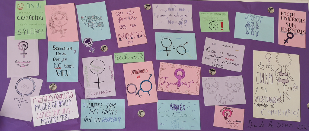 L’alumnat va decidir que, des de les diferents tutories, es portés a terme una sèrie de dinàmiques que ajudessin a reflexionar sobre qüestions d’igualtat de gènere. Aquestes es van dividir en els dos cicles. A primer cicle, l’alumnat va relacionar conceptes i definicions com per exemple: feminisme, masclisme o sororitat i, a continuació, van escriure reflexions o van fer dibuixos relacionats amb el que havien treballat prèviament o amb la diada del 8M. A segon cicle, es va proposar que l’alumnat escrivís experiències de desigualtat que coneixien o que havien viscut.