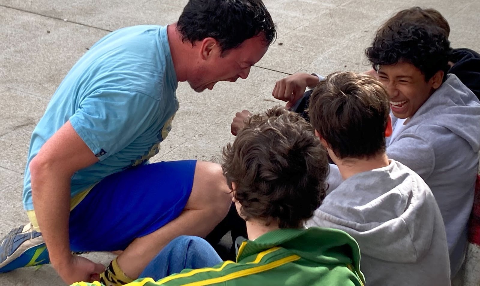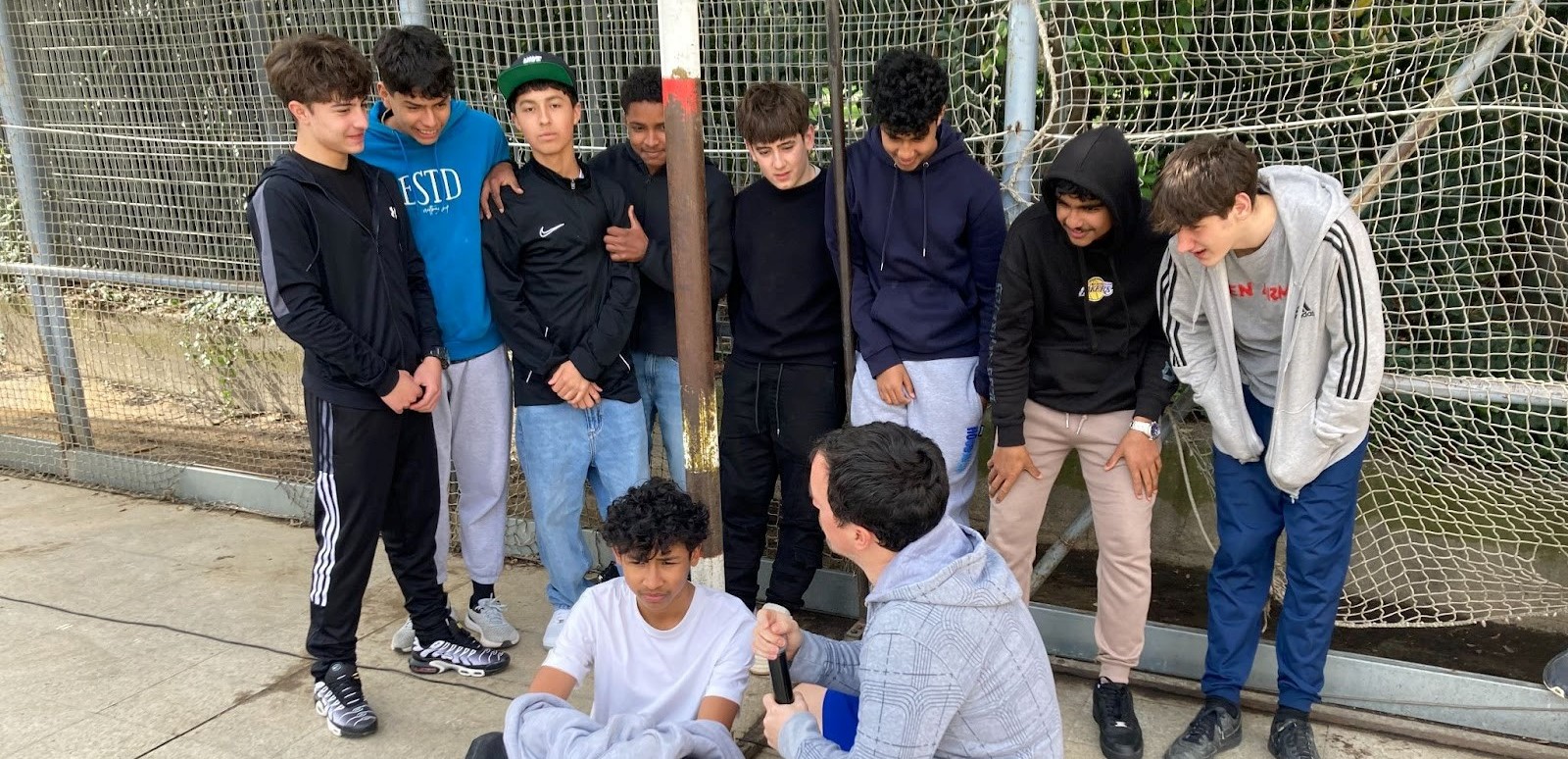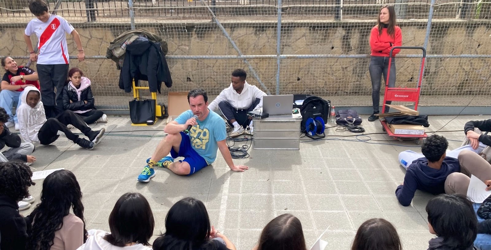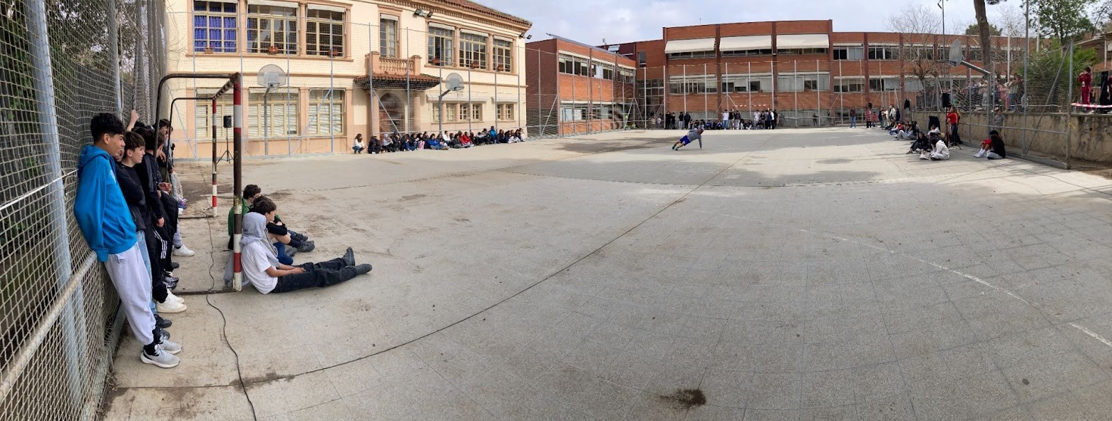 El micro queda arraconat a un lateral de la pista, i comença una successió de temes musicals, de moviments, de desplaçaments llargs de banda a banda i en diagonal, que dura una vintena de minuts. L’alumnat s’ha arrambat contra la xarxa que limita la pista, i s’ho mira des de la distància. Cares d’incredulitat, d’indiferència, de sorna… algun somriure, també.
