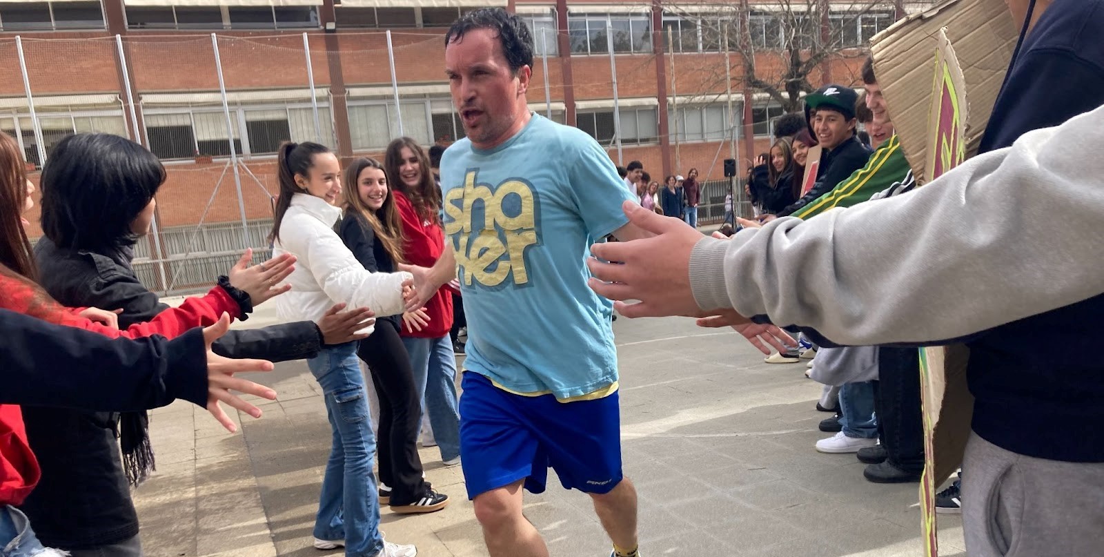 Bigas, que per uns minuts ha passat de córrer a passejar, reprèn el ritme. De cop marxa corrents cap a l’altra punta del pati, i desapareix cap a l’interior de l’institut. A algú se li han encès les ganes de córrer i pretén sortir a perseguir-lo. El públic s’ha quedat sol, i pels altaveus se’ls demana de fer-li un passadís. La gent s’aixeca i s’hi posa, i quan finalment ell reapareix i el travessa, l’eufòria o el cachondeo es desferma.