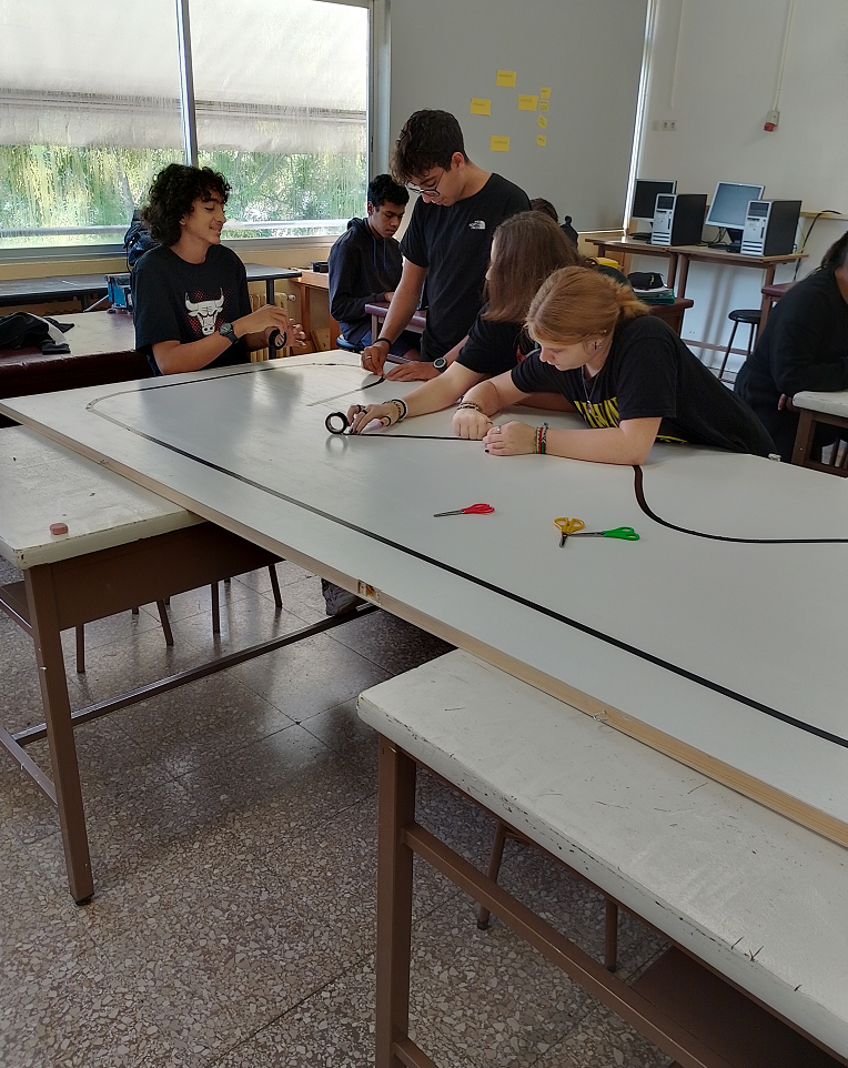 Un grup d’alumnes juntament amb el professor van muntar una pista pintada de blanc i amb cinta negre van fer un recorregut tancat. El projecte més recent ha consistit a programar entre tots el robot perquè segueixi el circuit elaborat prèviament.