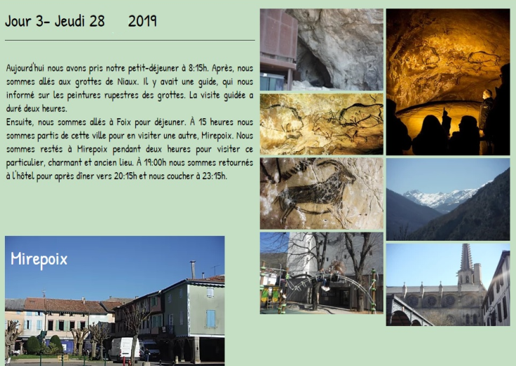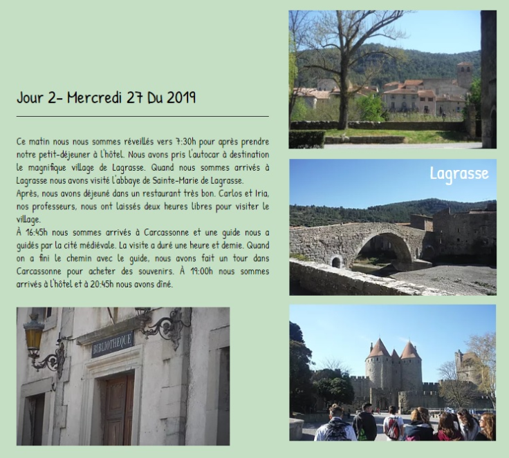 Chaque année, les élèves de 3ème ESO qui ont choisi le Français comme matière optative partent en voyage au sud de la France. L’année dernière, nous avons visité Collioure, Lagrasse, Carcassonne, Niaux et , de retour, la réserve africaine de Sigean.