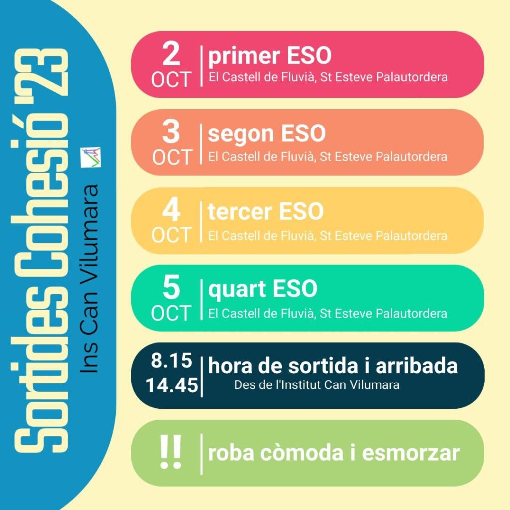ESO: Sortides de cohesió la primera setmana d’octubre Administrador web29/09/23 PROGRAMA SORTIDA COHESIÓ ESO (