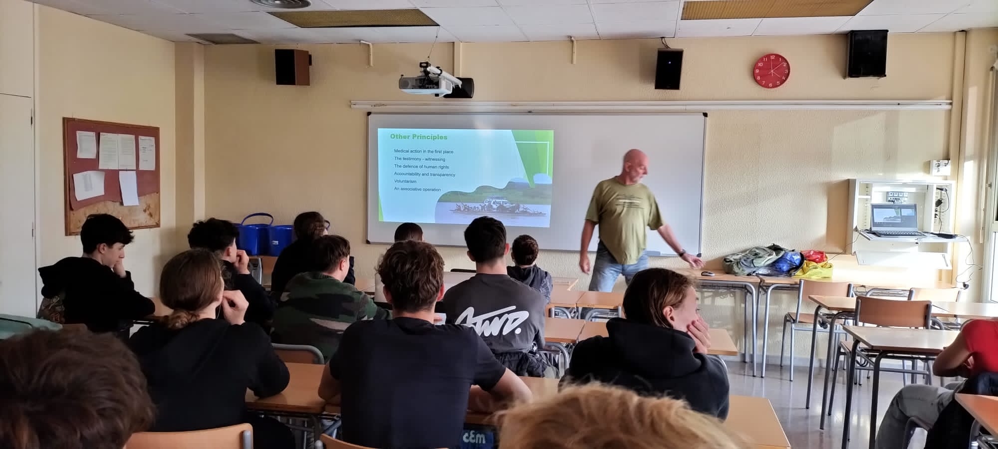 As in recent years, last week Paul Jawor, a member of the association Médicins Sans Frontières, came to visit us at the school. During his visit, he explained to the students of 4th year of ESO the different projects related to water consumption that MSF is developing in different countries. In this sense, he made a comparison between the average amount of water spent by a person in our country and that spent in developing countries. He also led a practical activity in which students measured the amount of chlorine in the water we consume in Sant Cugat. It is worth saying that this visit has been a good contribution to make the students aware of the importance of appreciating such an indispensable resource as water, as well as learning to regulate its consumption.
