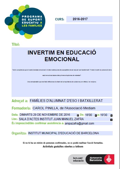 Es celebra a l’institut una acció formativa per a famílies d’alumnat d’ESO i batxillerat, titulada “Invertim en educació emocional” L’acció es desenvoluparà el dimarts 29 de novembre de 2016, a les 18 hores i a la Sala d’Actes de l’institut. Consulteu al cartell, la resta de dades relacionades amb aquesta interessant iniciativa.