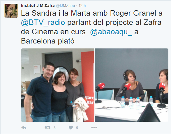 Les professores Sandra Gimeno i Marta Moya, entrevistades a BTV ràdioPer Caterina Albert / 19/09/2016 / ESO Portada / cinema, ràdio Entrevistades al programa La Tarda de Barcelona, amb els periodistes Núria Farré i Roger Granel Podeu escoltar l’entrevista a les professores, (a partir del minut 4:18), aquí : http://agora.xtec.cat/iesm-jmzafra/wp-content/uploads/usu164/2016/09/2016_09_19_BTVRadio-Roger-Granel-Marta-Moya.mp3