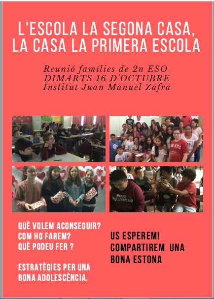 Reunions amb famílies d’inici de curs 2018 – 2019 (1r i 2n d’ESO)Per Caterina Albert / 10/10/2018 / AFA ESO ESO 1 ESO 2 Institut Notícies 2018 2019 Portada Us informem de les dates i hores de les properes reunions amb famílies de l’alumnat de 1r i 2n d’ESO. Son les següents: Per 1r d’ESO: dimarts 23 d’octubre a les 18:00 hores Per 2n d’ESO: dimarts 16 d’octubre a les 18:00 hores