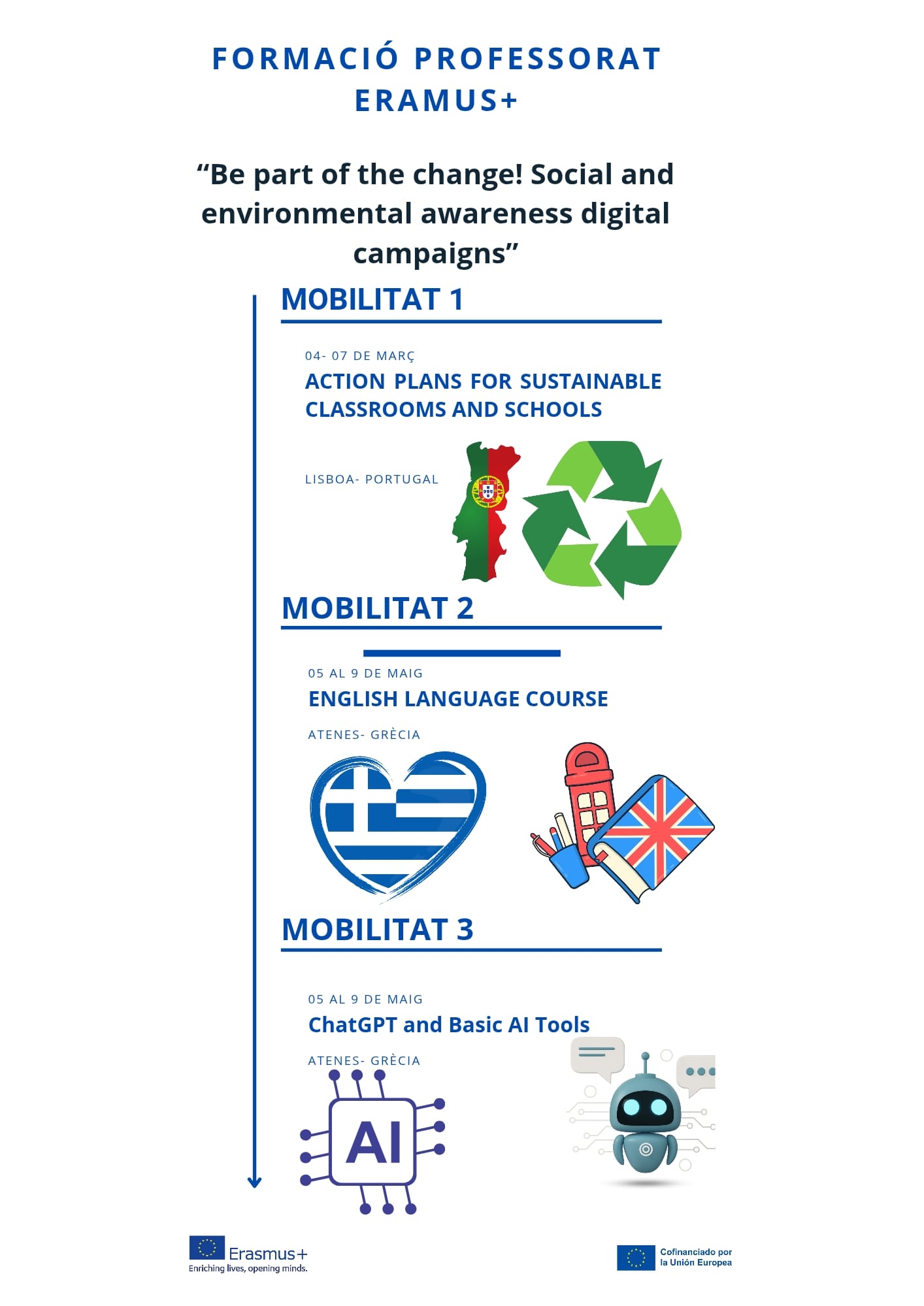 Dues professores i quatre professors del nostre institut han estat escollits per realitzar tres cursos de formació en diferents països de la Unió Europea dins el programa Erasmus+. Els cursos proporcionaran estratègies per crear un pla d’acció per fer del nostre centre un espai més sostenible, i ajudaran al nostre professorat a millorar la competència lingüística en llengua anglesa i la competència digital.