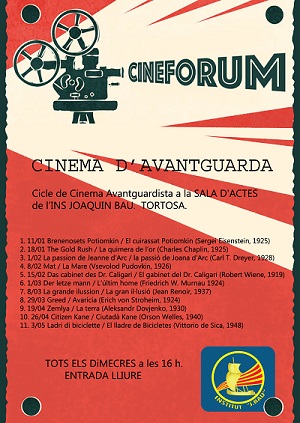 A partir del mes de gener el departament d’educació visual i plàstica de l’institut Joaquim Bau inicia una activitat relacionada amb el món del cinema. Es tracta d’un cinefòrum de cinema d’avantguarda. Aquesta activitat pensada per a l’alumnat que cursa els batxillerats artístics al nostre institut, també està oberta a tota la comunitat educativa del