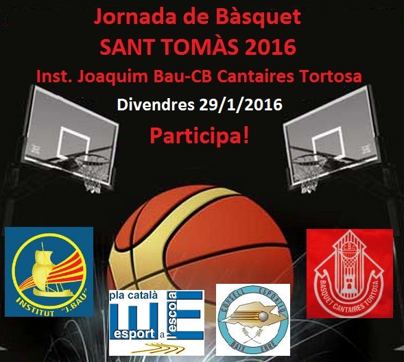 El CB Cantaires Tortosa organitza conjuntament amb l’Institut Joaquim Bau la Jornada de Bàsquet -Santa Tomàs 2016- per a tots el alumnes de centre. Aquesta activitat també comptarà amb la col.laboració del Consell Esportiu del Baix Ebre. La jornada tindrà lloc el proper Divendres 29/1/2016 a la pista de bàsquet del centre de les 12:30h