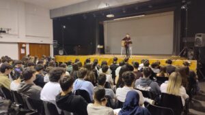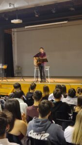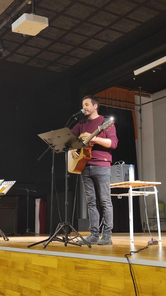 El dijous 24 d’abril els alumnes de 1r de batxillerat van gaudir de l’actuació de Pau Alabajos. El cantautor valencià, també filòleg, va interpretar diverses cançons en què ha musicat poemes de Vicent Andrés Estellés, de qui l’any passat vam celebrar el centenari del naixement. Alabajos va contextualitzar cada un dels poemes, ressaltant la figura del gran poeta valencià i les característiques de la seua obra, des del tractament dramàtic i alhora popular de la mort fins a l’expressió de l’amor més carnal, sense oblidar el compromís cívic i de país. Peces com “Cançó de bressol” o “Els amants” mantenen viva la memòria d’Estellés, considerat per alguns el millor poeta valencià des d’Ausiàs March. I versos com els següents expliquen la trascendència de la seua figura: “Allò que val és la consciència de no ser res si no s’és poble”.