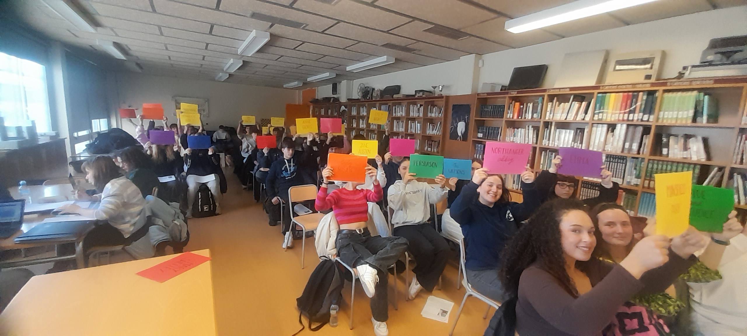 Com a gest simbòlic i reivindicatiu, l’alumnat va realitzar una aixecada de cartolines amb els títols de les obres dels dos autors homenatjats, recordant la vigència i la rellevància de les seues veus literàries.