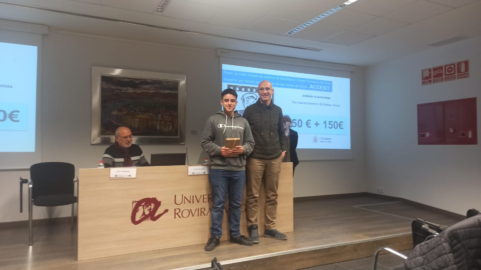 L’alumne Pau Cutanda Domènech de 2n de batxillerat B, ha rebut el 2n premi al millor treball de recerca en l’àmbit sanitari convocat per l’acadèmia de ciències mèdiques de les Terres de l’Ebre i emmarcat dins de les Jornades mèdiques i de la salut que van tenir lloc el passat 2 i 3 de març. El treball es titula “Antibiòtics vs bacteriòfags“. Els alumnes del nostre centre Pau Garcia, Ares Puentes i Núria Ferrer, també van exposar els seus treballs de recerca. Enhorabona als quatre!!