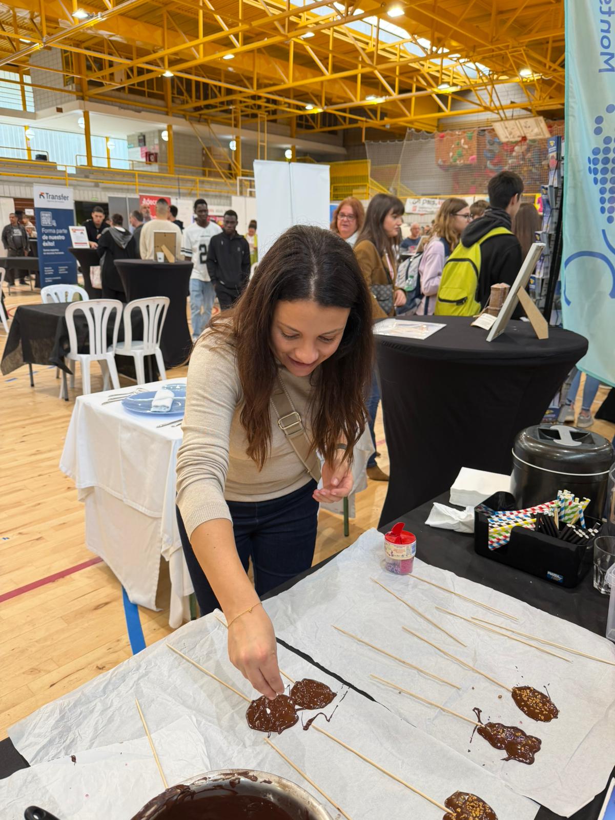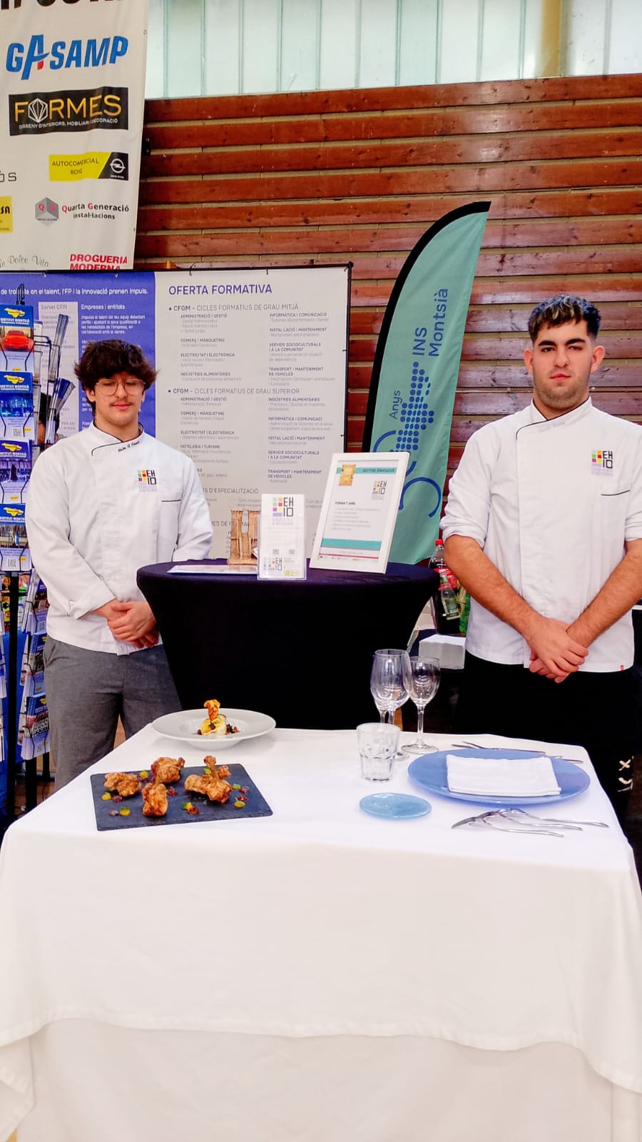 A més, David Puerto i Naim El Founti, estudiants del CFGM de Cuina i Gastronomia, van elaborar en directe piruletes de xocolata a l’estand de l’escola, convertint-lo en un punt d’atracció per al públic i demostrant el bon nivell de la formació pràctica del cicle. A més l’alumnat del CFGM de cuina i gastronomia va visitar l’ferta i participar de l’escape room d’emprenedoria.